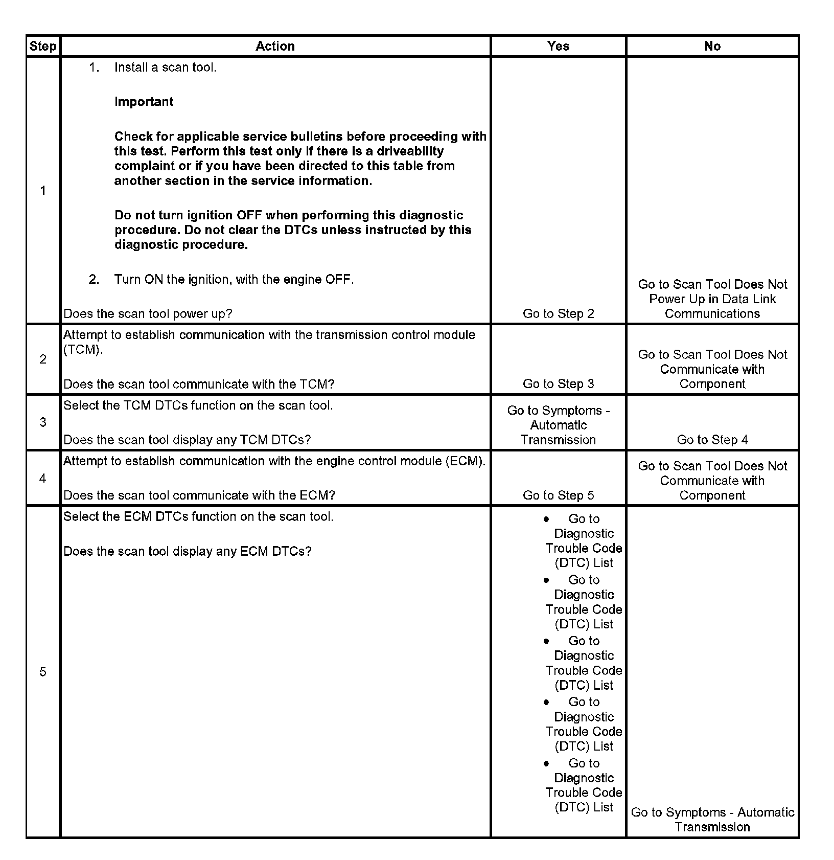 The Diagnostic System Check - Automatic Transmission is an organized approach to identify a condition created by an automatic transmission. The Diagnostic System check is the diagnostic starting point for an automatic transmission concern. The Diagnostic System Check directs you to the next logical step for diagnosing a transmission concern. Perform this check only if there is a driveability concern or if you have been directed here from other service information. Follow the table to help reduce diagnostic time and help prevent unnecessary replacement of good parts.