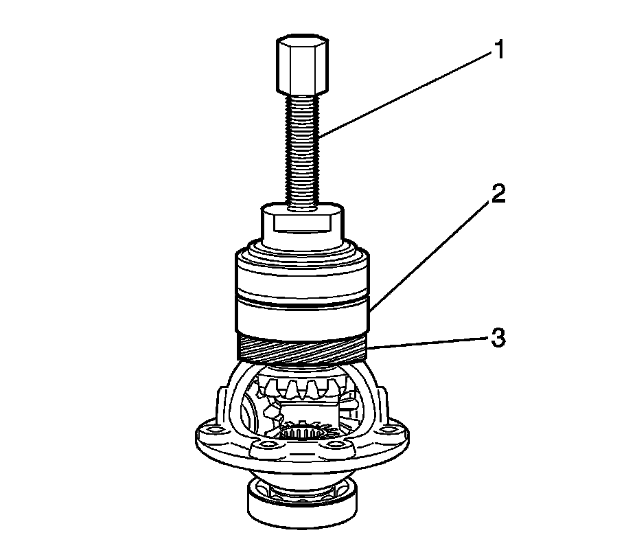 12. Remove the differential left side bearing using the DW220-020A-01 (1) and the DW220-020A-03 (2).