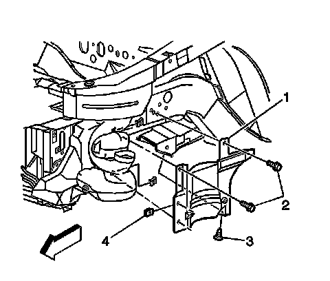 3. Use J 38778 to remove the push-in retainer (3) holding the left engine splash shield to the lower flange of the engine compartment side rail.