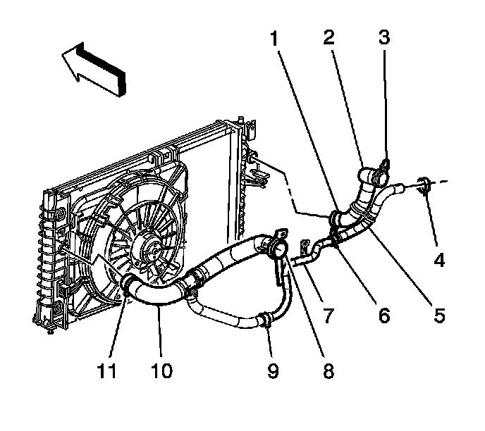 9. Install the radiator outlet hose (6) to the radiator.