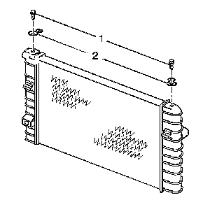 5. Remove the radiator upper mounting bolts (1) and the upper radiator mounts (2).