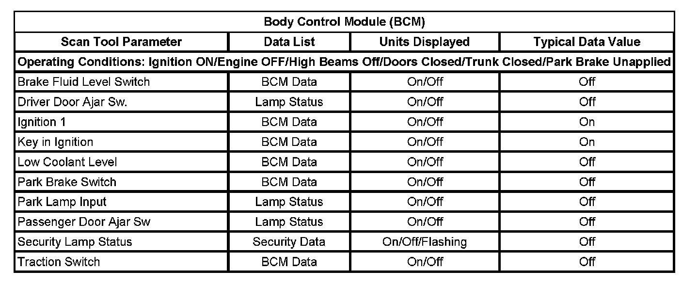 Scan Tool Data List - Body Control Module (BCM)