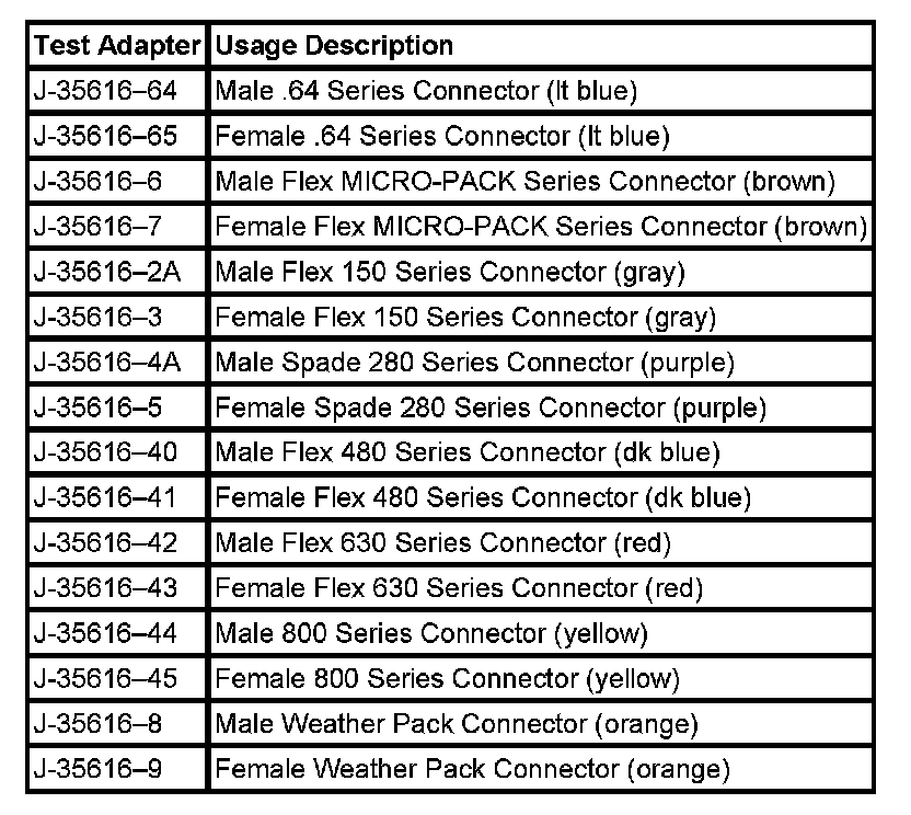 NOTE: Do not insert test equipment probes into any connector or fuse block terminal. The diameter of the test probes will deform most terminals. A deformed terminal can cause a poor connection, which can result in system failures. Always use the J 35616-B Connector Test Adapter Kit or the J 42675 Flat Wire Probe Adapter Kit in order to frontprobe terminals. Do not use paper clips or other substitutes as they can damage terminals and cause incorrect measurements.