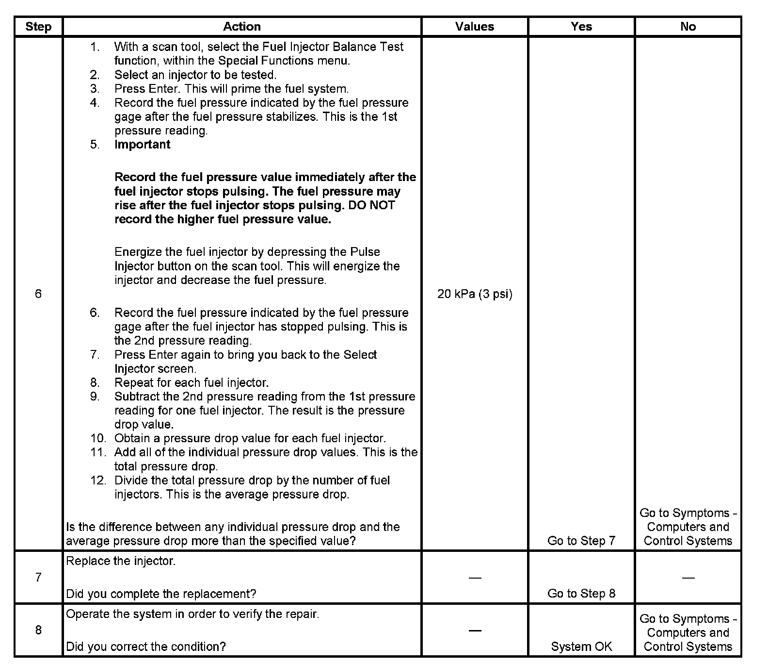 The scan tool is first used to energize the fuel pump relay. The scan tool is then used to pulse each injector for a precise amount of time allowing a measured amount of fuel into the manifold. This causes a drop in system fuel pressure that can be recorded and used to compare each injector.