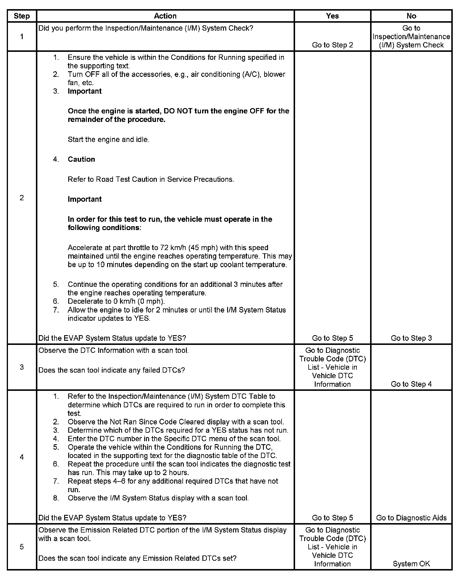 The purpose of this test is to satisfy the enable criteria necessary to execute inspection/maintenance (I/M) readiness diagnostics for the evaporative emission (EVAP) system. The test may be used to set the I/M System Status indicators to YES. The I/M System Status Display on the scan tool provides an indication of whether the control module has completed the required tests. The I/M System Status does not indicate that the tests have passed or failed. When all of the diagnostics for a specific system have run and passed the I/M System Status will update to YES. If a test for a specific system has failed, the I/M System Status will update to YES, indicating a determination was made, even if all of the other tests for that system have not run. Performing a visual inspection prior to running the EVAP test may prevent having to repeat the test. A failed or aborted test will require the vehicle to cool down in order to meet the enable criteria to run another test.
