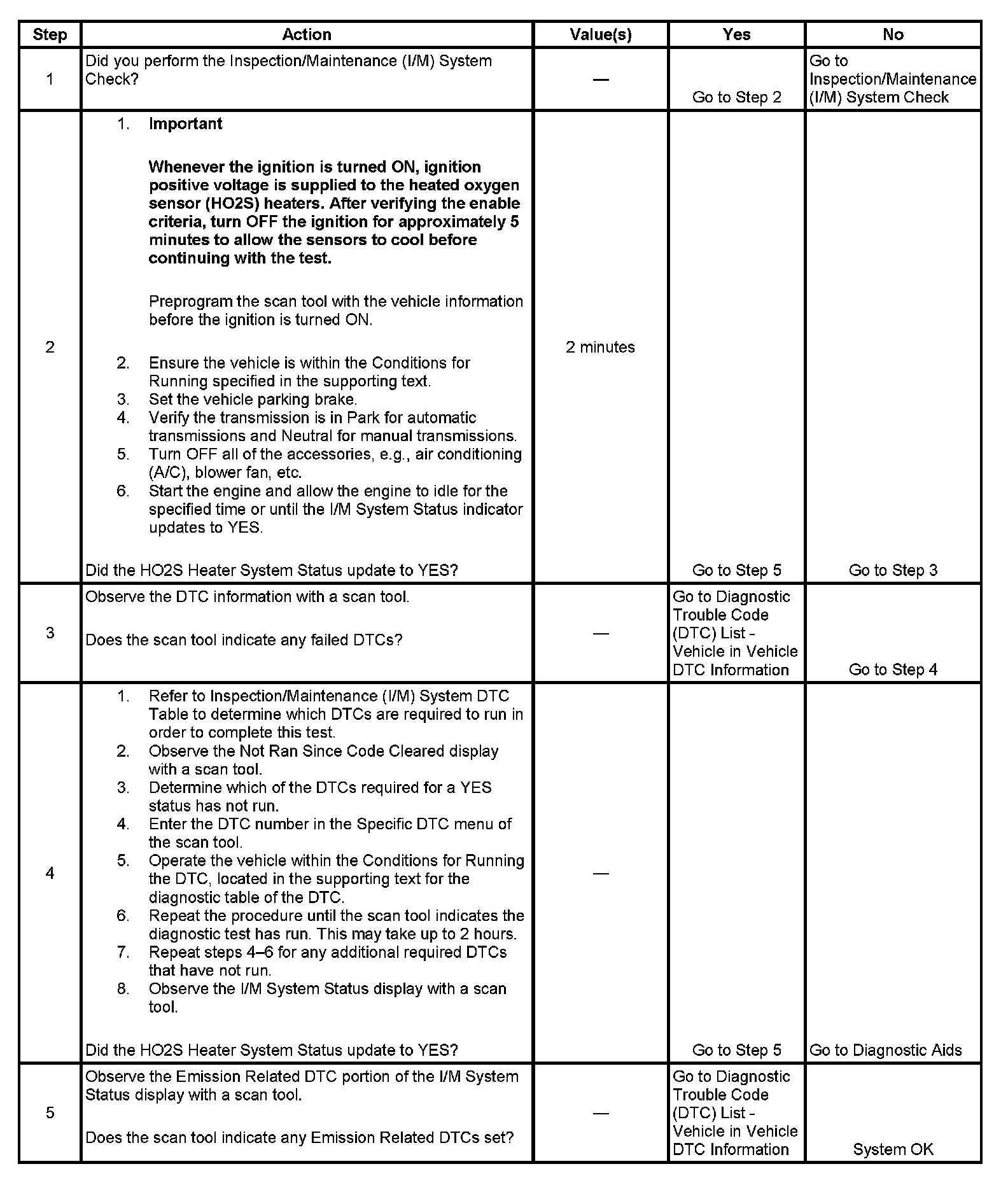 The purpose of this test is to satisfy the enable criteria necessary to execute inspection/maintenance (I/M) readiness diagnostics for the heated oxygen sensor (HO2S) heater system. The test may be used to set the I/M System Status to YES. The I/M System Status Display on the scan tool provides an indication of whether the control module has completed the required tests. The I/M System Status does not indicate that the tests have passed or failed. When all of the diagnostics for a specific system have run and passed the I/M System Status will update to YES. If a test for a specific system has failed, the I/M System Status will update to YES, indicating a determination was made, even if all of the other tests for that system have not run.