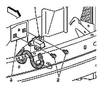 7. Remove the sensor (1) from the hood latch support bracket (3).