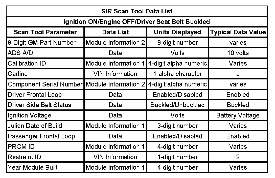 The SIR Scan Tool Data List contains all the restraint system related parameters that are available on the scan tool. The parameters in the list are arranged in alphabetical order. The column, "Data List," indicates the location of the parameter within the scan tool menu selections.