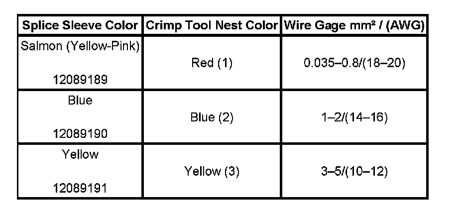 5. Use the Splice Crimp Tool from the J-38125 to crimp duraseal splice sleeve. In order to position the duraseal splice sleeve in the proper color nest of the Splice Crimp Tool, refer to the table at the beginning of this repair procedure.