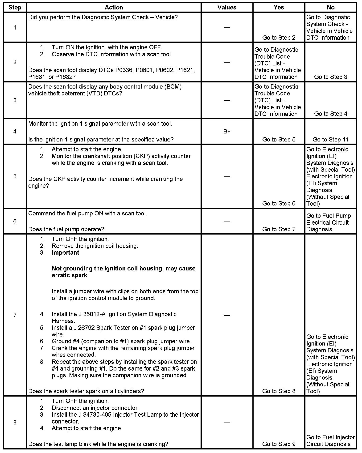 The Engine Cranks but Does Not Run diagnostic table assumes the following: