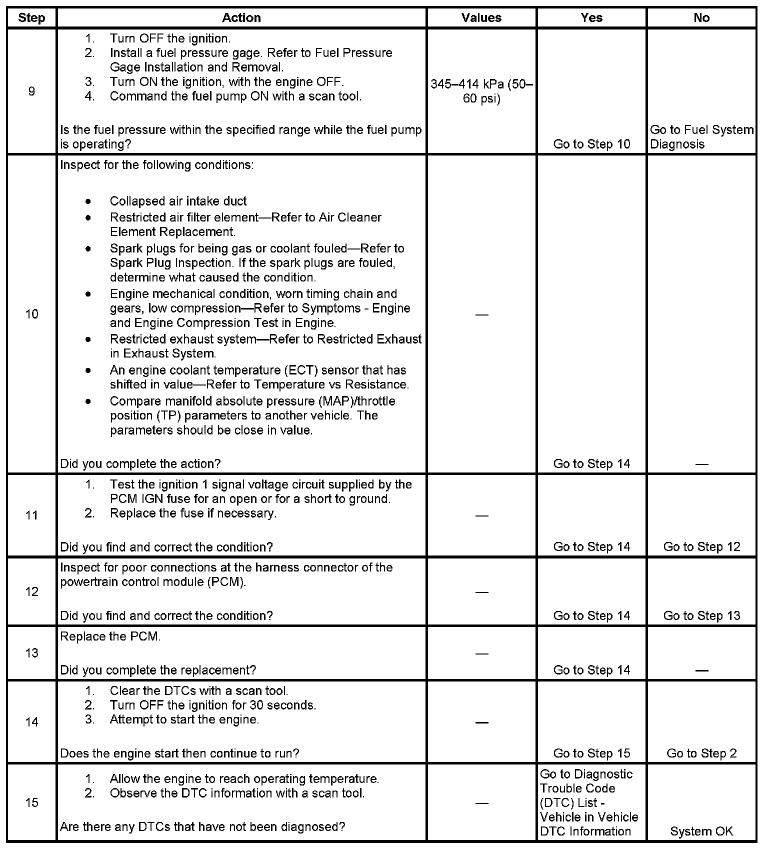The Engine Cranks but Does Not Run diagnostic table is an organized approach to identifying a condition that causes an engine not to start. The Engine Cranks but Does Not Run diagnostic table directs the service technician to the appropriate system diagnosis.