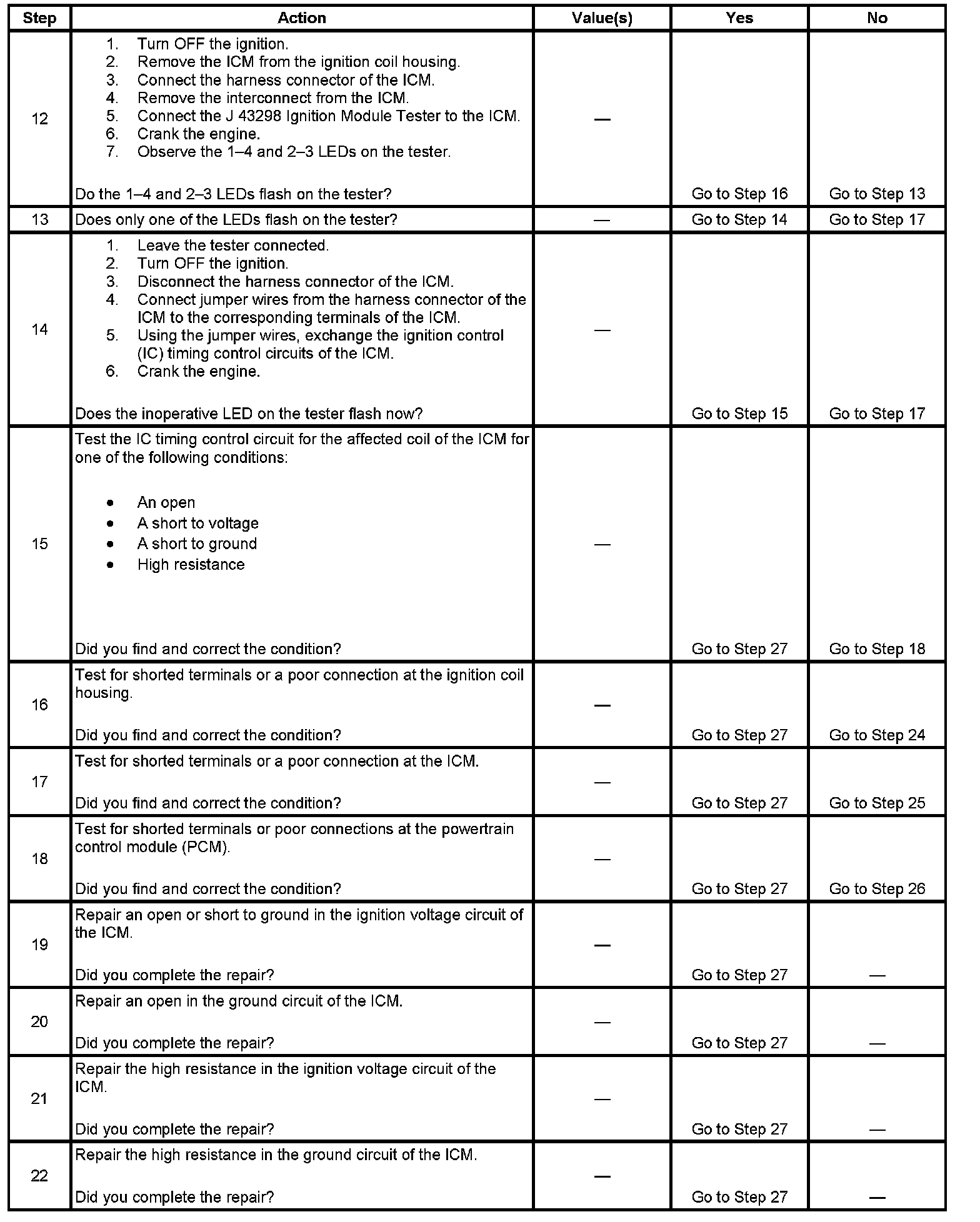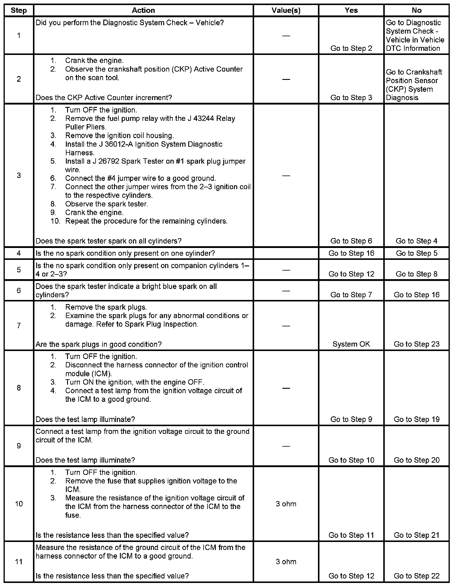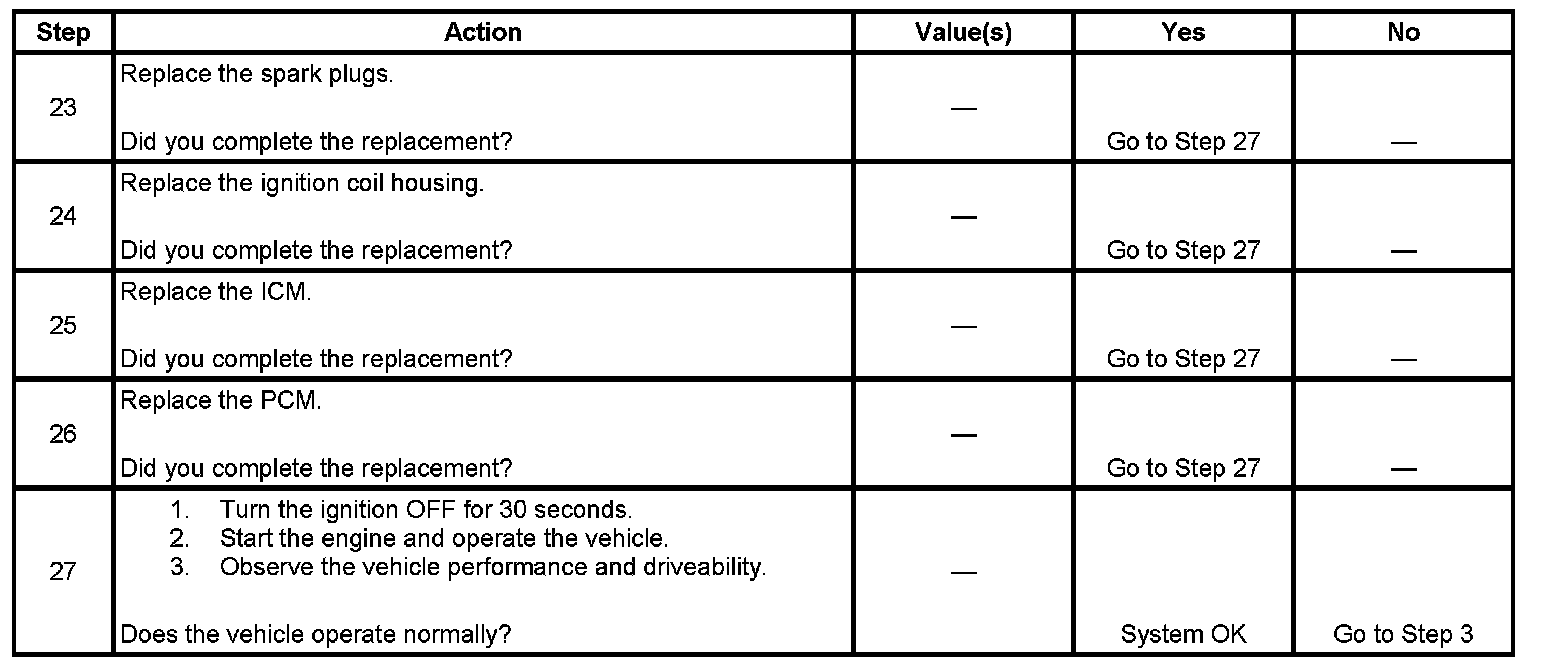 Each ignition coil supplies secondary voltage to a pair of spark plugs. This is called a waste spark ignition system. The powertrain control module (PCM) supplies a signal on each of the ignition control (IC) timing control circuits to the ignition control module (ICM). The ICM fires the correct ignition coil at the correct time based on the signals. The ICM detects if cylinder 1 or cylinder 3 is on the compression stroke by sensing the secondary voltage and polarity of each side of the ignition coil. The ICM detects this voltage with sensing circuitry integrated into each ignition coil. The higher voltage is on the compressing cylinder. This is called compression sense ignition. The ICM provides a synthesized cam signal to the PCM based on these inputs. The PCM uses the cam signal to synchronize fuel injection.