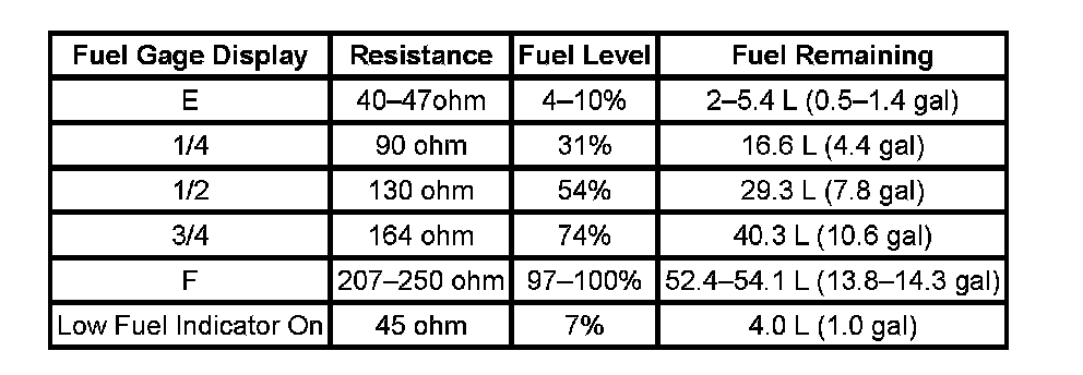 The information in this table is intended for use with the J 33431-C Signal Generator and Instrument Panel Tester. The fuel level sensor values represent the test values to be used on the Signal Generator to drive the fuel gage display to the indicated positions. Vehicles that require more than one fuel level sensor calculate gage position from many possible resistance combinations of fuel levels between the two tanks. Therefore, the values in the table may not correlate directly to readings taken from the vehicle primary or secondary sending units.