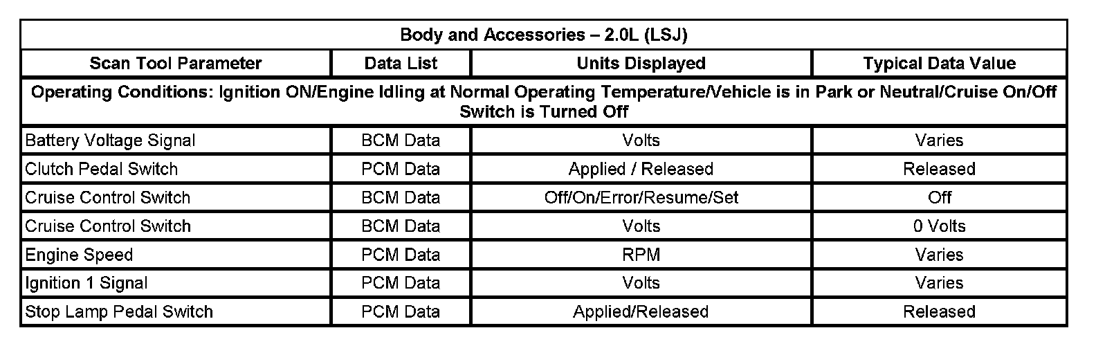 The scan tool data lists contain all of the cruise control related parameters that are available on the scan tool. The parameters in the list are arranged in alphabetical order. The data list column indicates the location of the parameter within the scan tool menu selections.