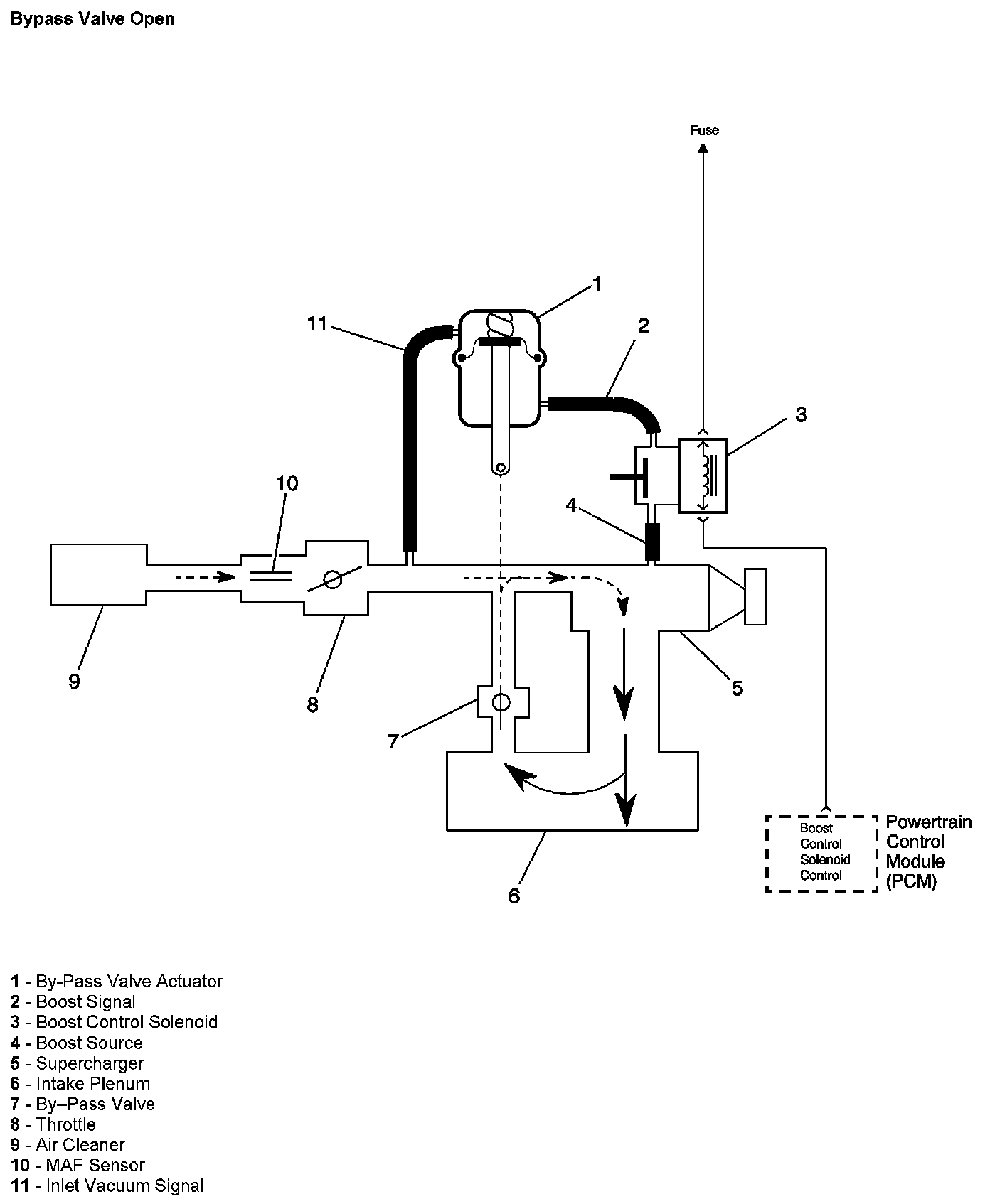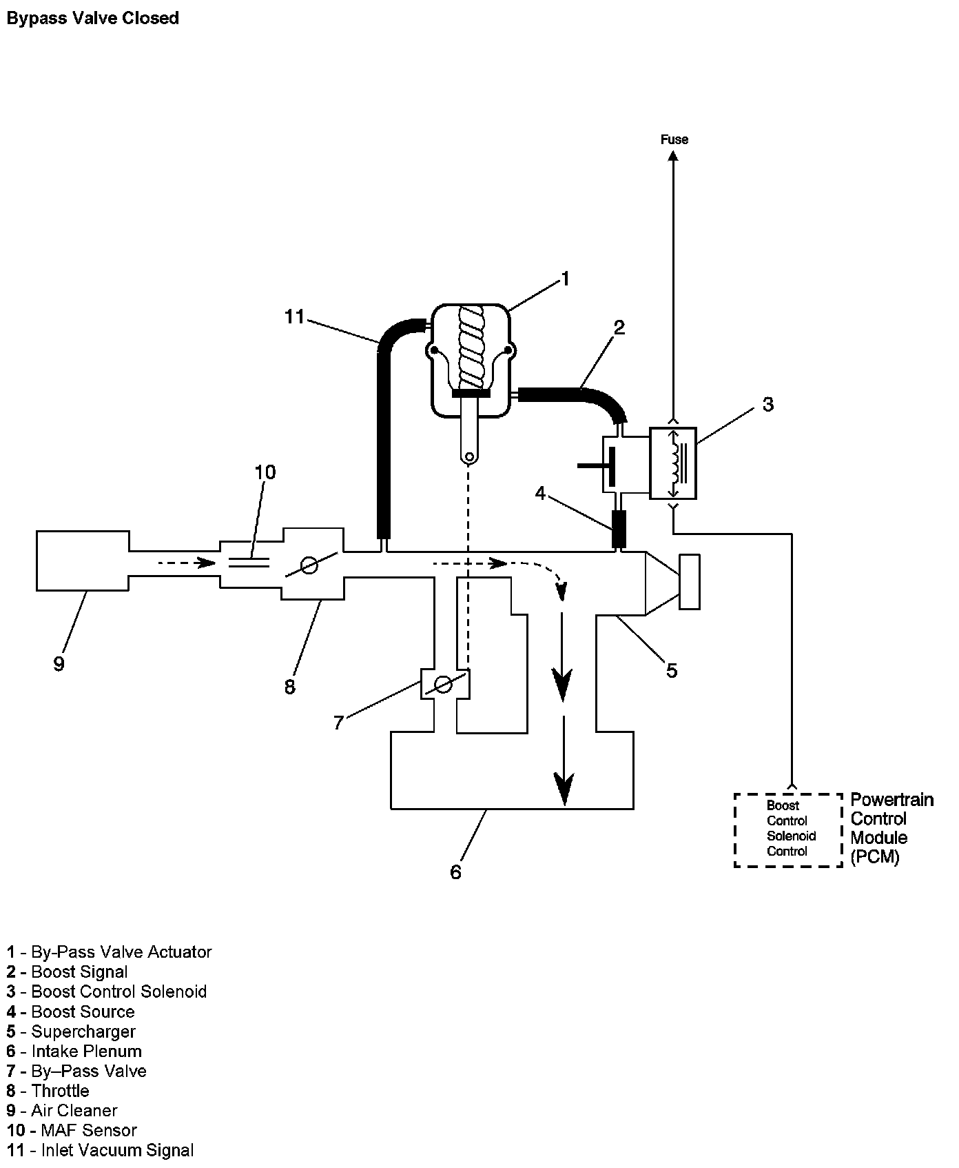 The PCM controls boost pressure by using the boost control solenoid. The boost control solenoid is normally an open valve. Under most conditions, the PCM commands the boost control solenoid to operate at a 99-100 percent duty cycle. This keeps the solenoid valve closed and allows only inlet vacuum to control the position of the bypass valve. At idle, engine vacuum is applied to the upper side of the bypass valve actuator, counteracting spring tension to hold the bypass valve open. As engine load is increased, engine vacuum is decreased, causing the spring in the bypass valve actuator to overcome the applied vacuum, closing the bypass valve and allowing the boost pressure to increase. The bypass valve starts to close when the vacuum measures 250 mm Hg (10 in Hg) and is fully closed at 90 mm Hg (3.5 in Hg). When reduced boost pressure is desired, the PCM commands the boost control solenoid to operate at a 0 percent duty cycle. This opens the solenoid valve and allows boost pressure to enter the bypass valve actuator at the lower side to counteract the spring tension, opening the bypass valve and recirculating excess boost pressure back into the supercharger inlet.