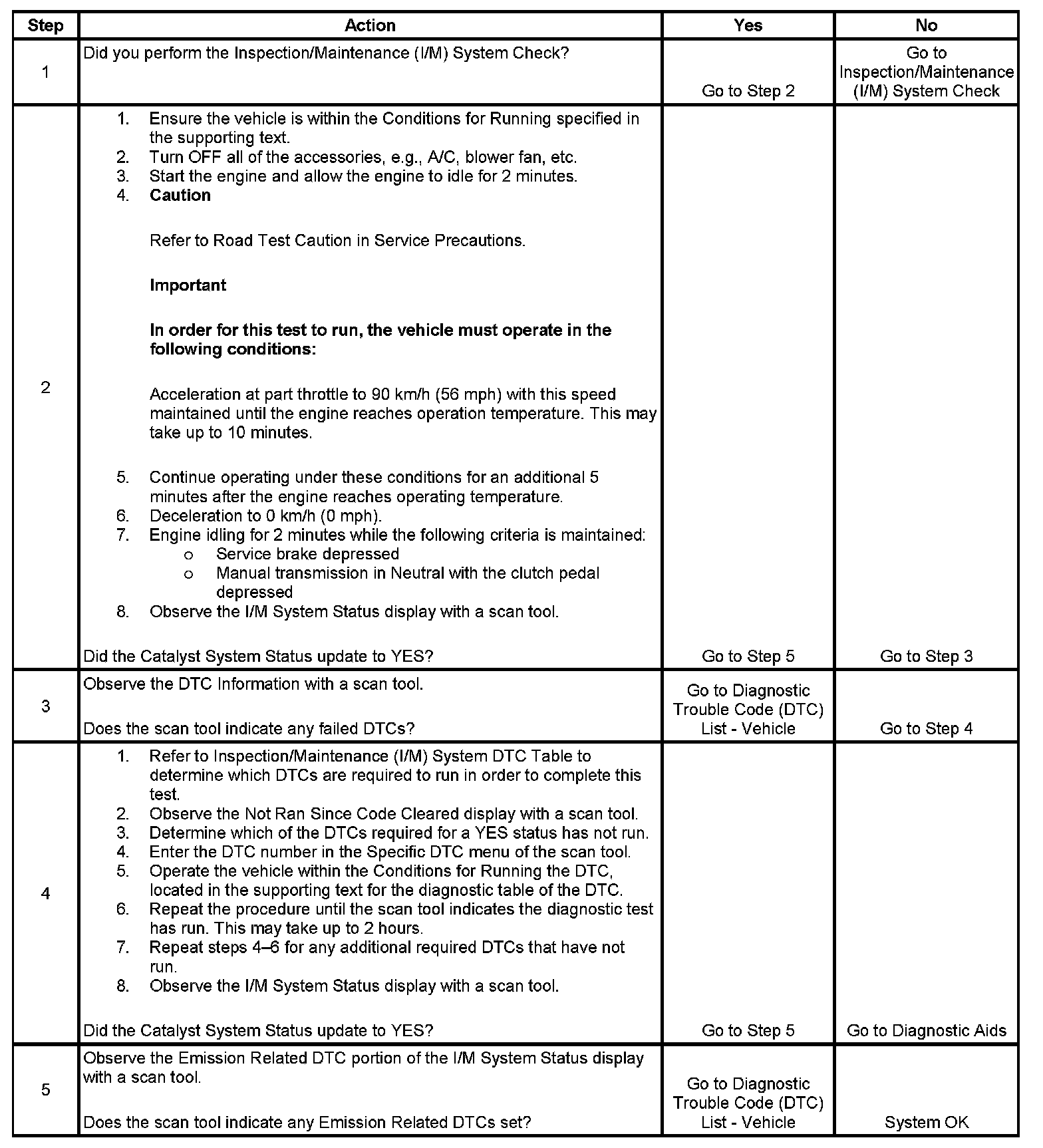 The purpose of this procedure is to satisfy the enable criteria necessary in order to execute the inspection/maintenance (I/M) readiness diagnostics for the Catalyst System. Ensure the vehicle meets the requirements listed in Conditions for Running before performing this test. Failure to meet the necessary requirements may produce inaccurate test results.