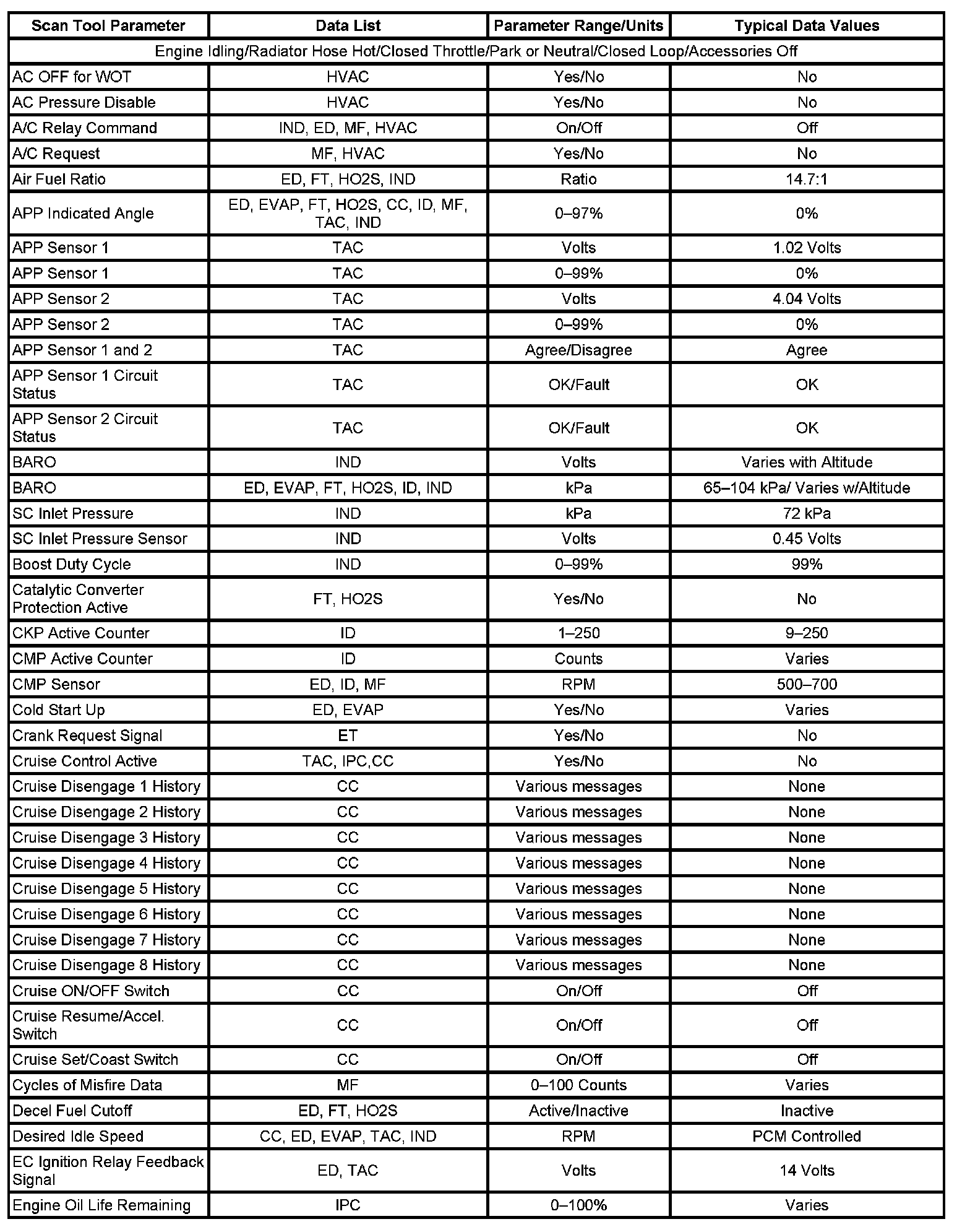 The Engine Scan Tool Data List contains all engine related parameters that are available on the scan tool. The list is arranged in alphabetical order. A given parameter may appear in any one of the data lists, and in some cases may appear more than once, or in more than one data list in order to group certain related parameters together.