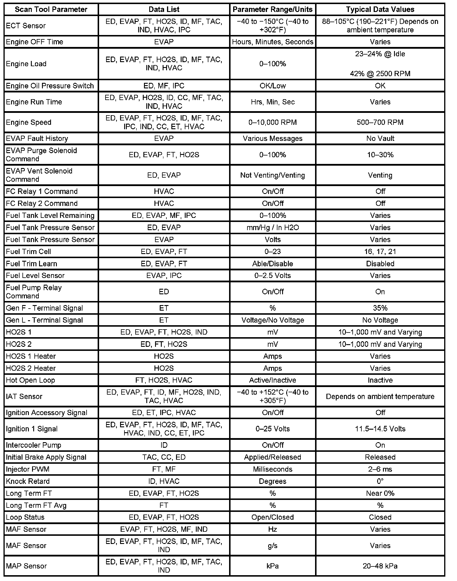 The column labeled Data List indicates where a parameter can be located on the scan tool. Refer to the scan tool operating manual for the exact locations of the data lists. The following is a description of each term listed: