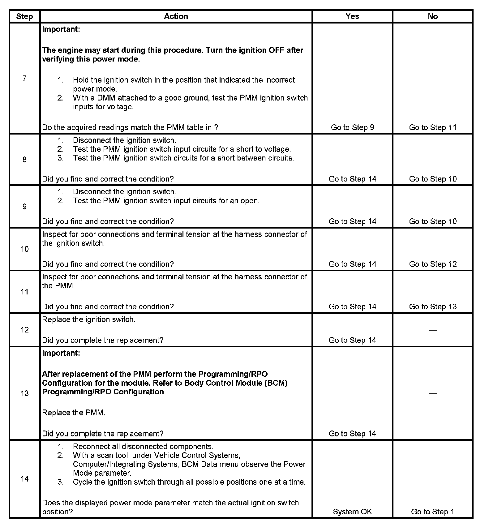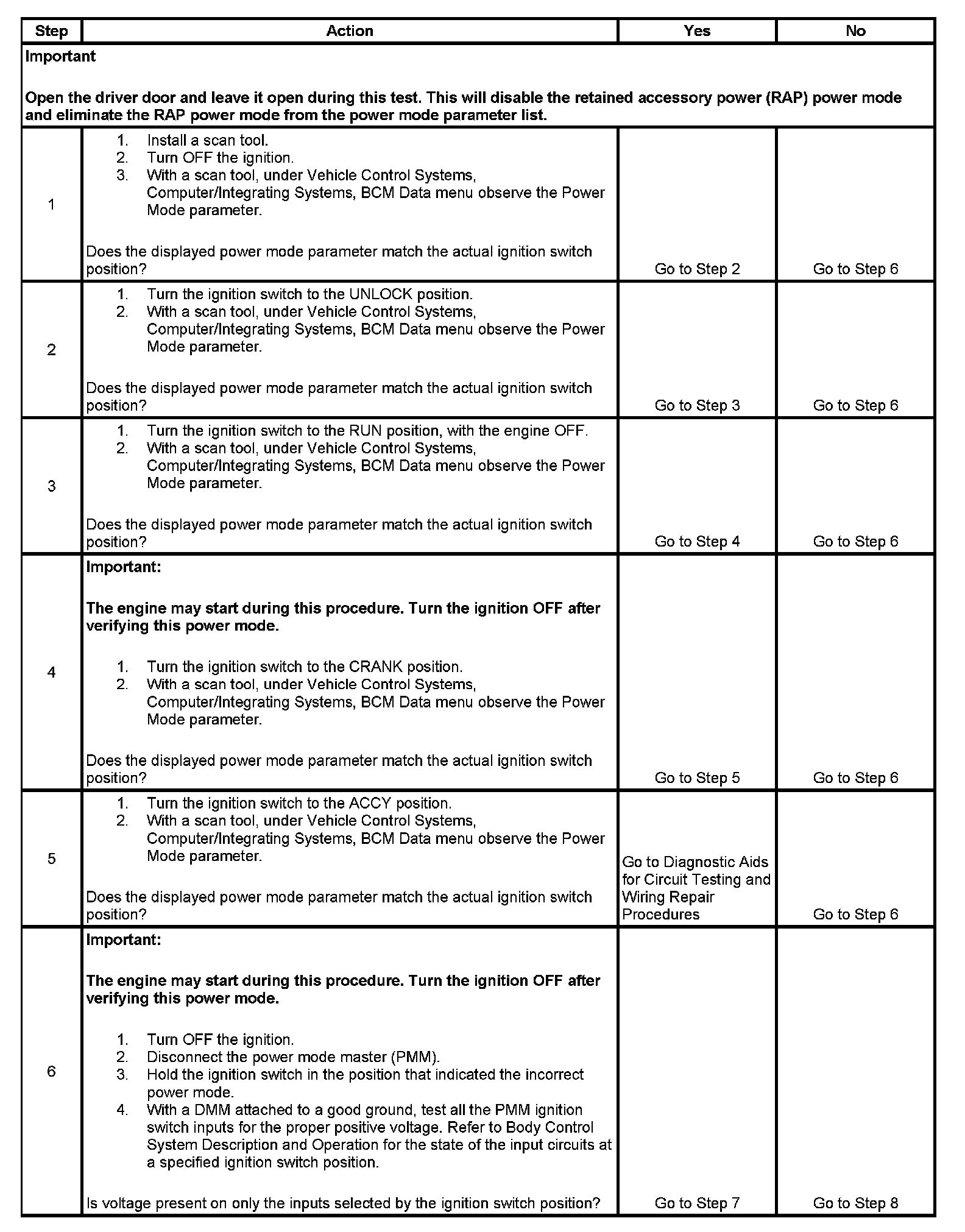 Normal vehicle serial data communications and the control modules operations will not begin until the system power mode has been identified. Discrete wires from the ignition switch contacts are monitored by a module which acts as the power mode master (PMM) in order to determine the correct power mode. The module which is the PMM communicates the system power mode to all modules on the serial data lines. Refer to Body Control System Description and Operation to identify which module is the PMM and the applicable power mode look up table.