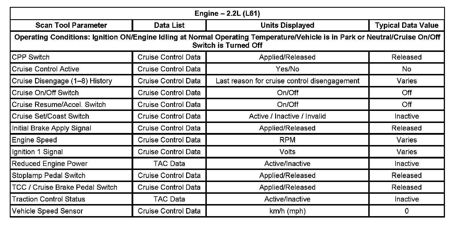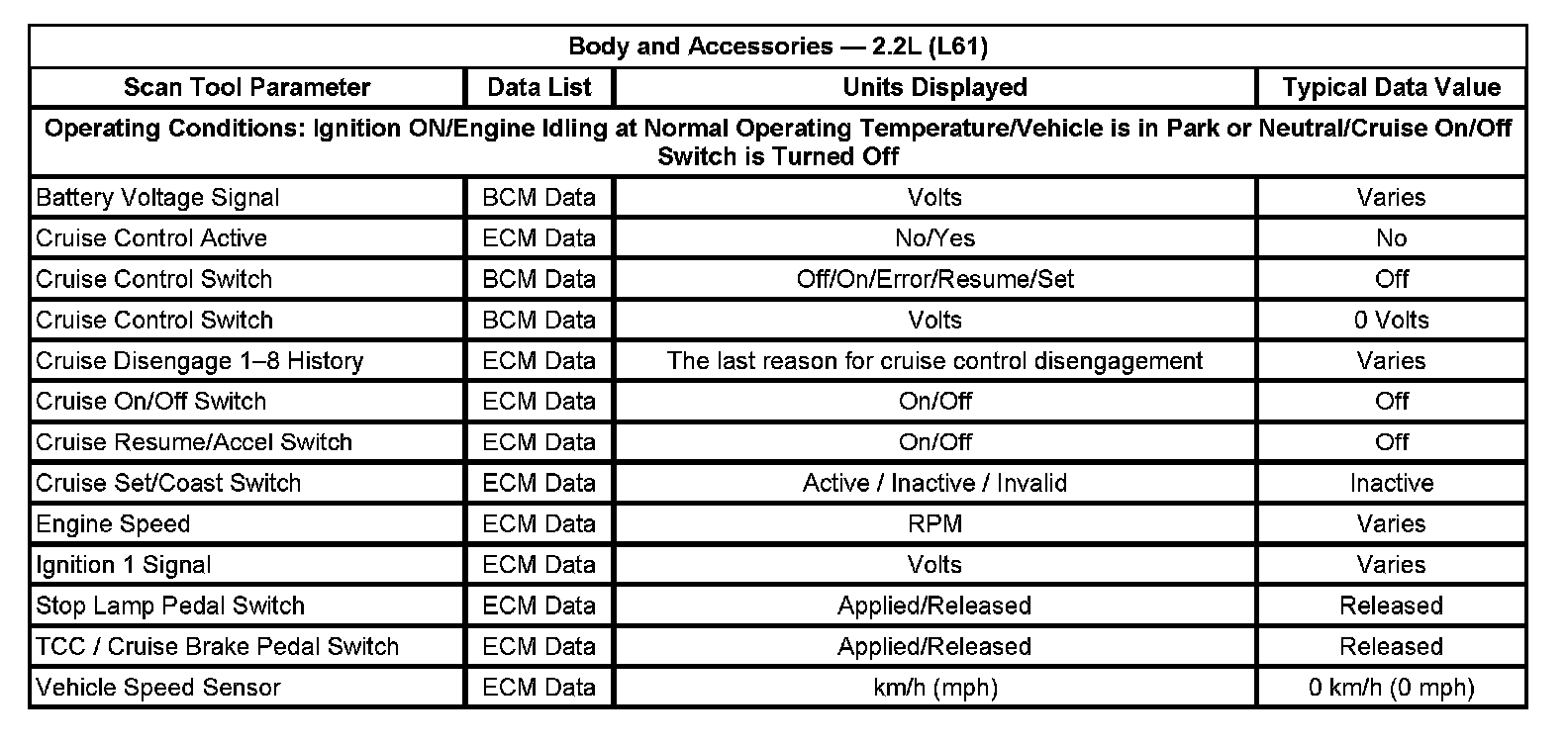 The scan tool data lists contain all of the cruise control related parameters that are available on the scan tool. The parameters in the list are arranged in alphabetical order. The data list column indicates the location of the parameter within the scan tool menu selections.
