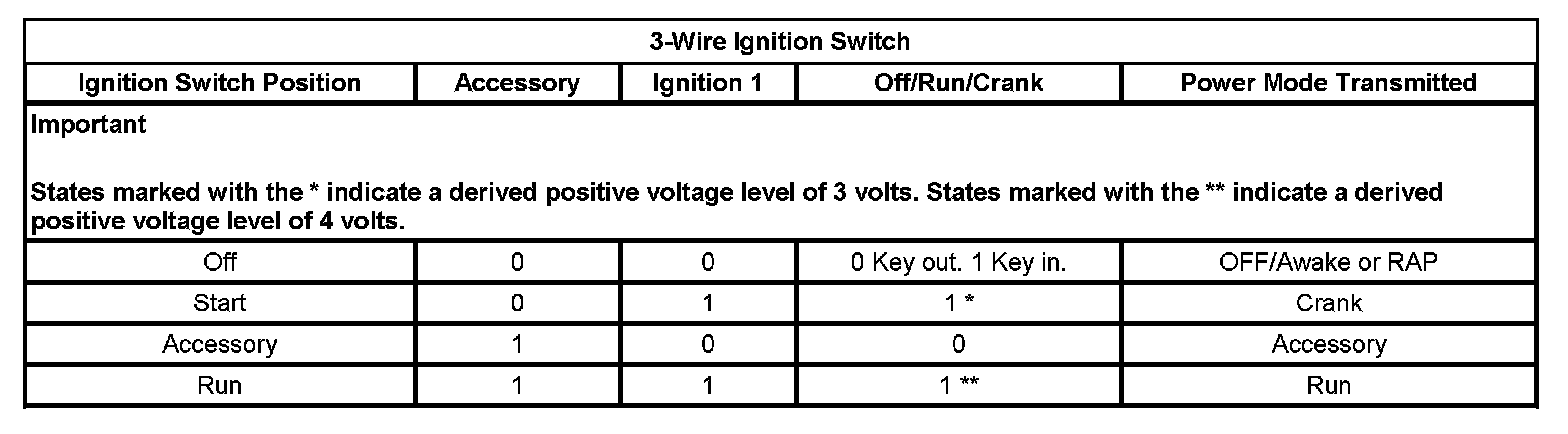 On vehicles that have several control modules connected by serial data circuits, one module is the power mode master (PMM). On this vehicle, the PMM is the body control module (BCM). The PMM receives 3 discrete ignition switch signals to differentiate which power mode will be sent over the Serial Data circuits. The 3-wire Ignition Switch table illustrates the state of these inputs in correspondence to the ignition switch position.