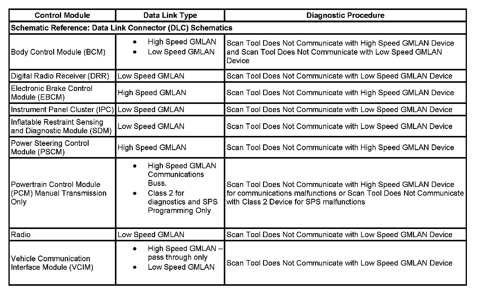 This table identifies which serial data link that a particular module uses for in-vehicle data transmission. Some modules may use more than one data link to communicate. Some modules may have multiple communication circuits passing through them without actively communicating on that data link. This table is used to assist in correcting a communication malfunction. For the description and operation of these serial data communication circuits, refer to Data Link Communications Description and Operation.