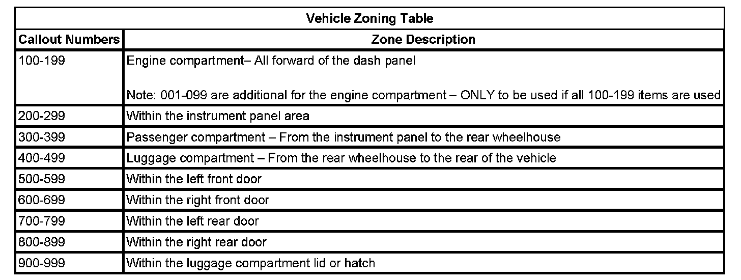 All grounds, in-line connectors, pass-through grommets, and splices have identifying numbers that correspond to where they are located in the vehicle. The table explains the numbering system.