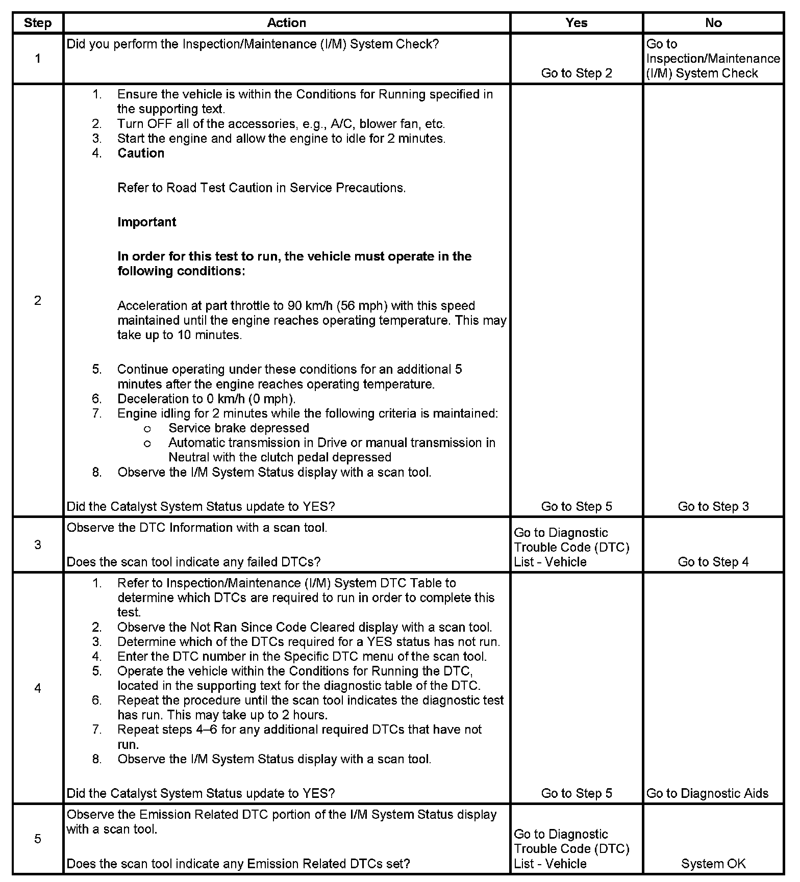 The purpose of this test is to satisfy the enable criteria necessary to execute inspection and maintenance (I/M) readiness diagnostics for the catalyst system. The test may be used to set the I/M System Status indicators to YES. The I/M System Status Display on the scan tool provides an indication of whether the control module has completed the required tests. I/M System Status does not indicate that the tests have passed or failed. When all of the diagnostics for a specific system have run and passed I/M System Status will update to YES. If a test for a specific system has failed, the I/M System Status will update to YES, indicating a determination was made, even if all of the other tests for that system have not run.