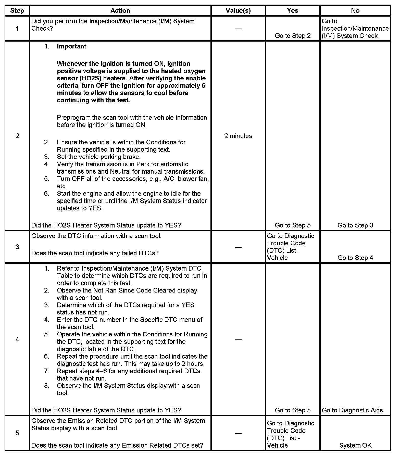The purpose of this test is to satisfy the enable criteria necessary to execute inspection and maintenance (I/M) readiness diagnostics for the heated oxygen sensor (HO2S) heater system. The test may be used to set the I/M System Status to YES. The I/M System Status Display on the scan tool provides an indication of whether the control module has completed the required tests. The I/M System Status does not indicate that the tests have passed or failed. When all of the diagnostics for a specific system have run and passed the I/M System Status will update to YES. If a test for a specific system has failed, the I/M System Status will update to YES, indicating a determination was made, even if all of the other tests for that system have not run.
