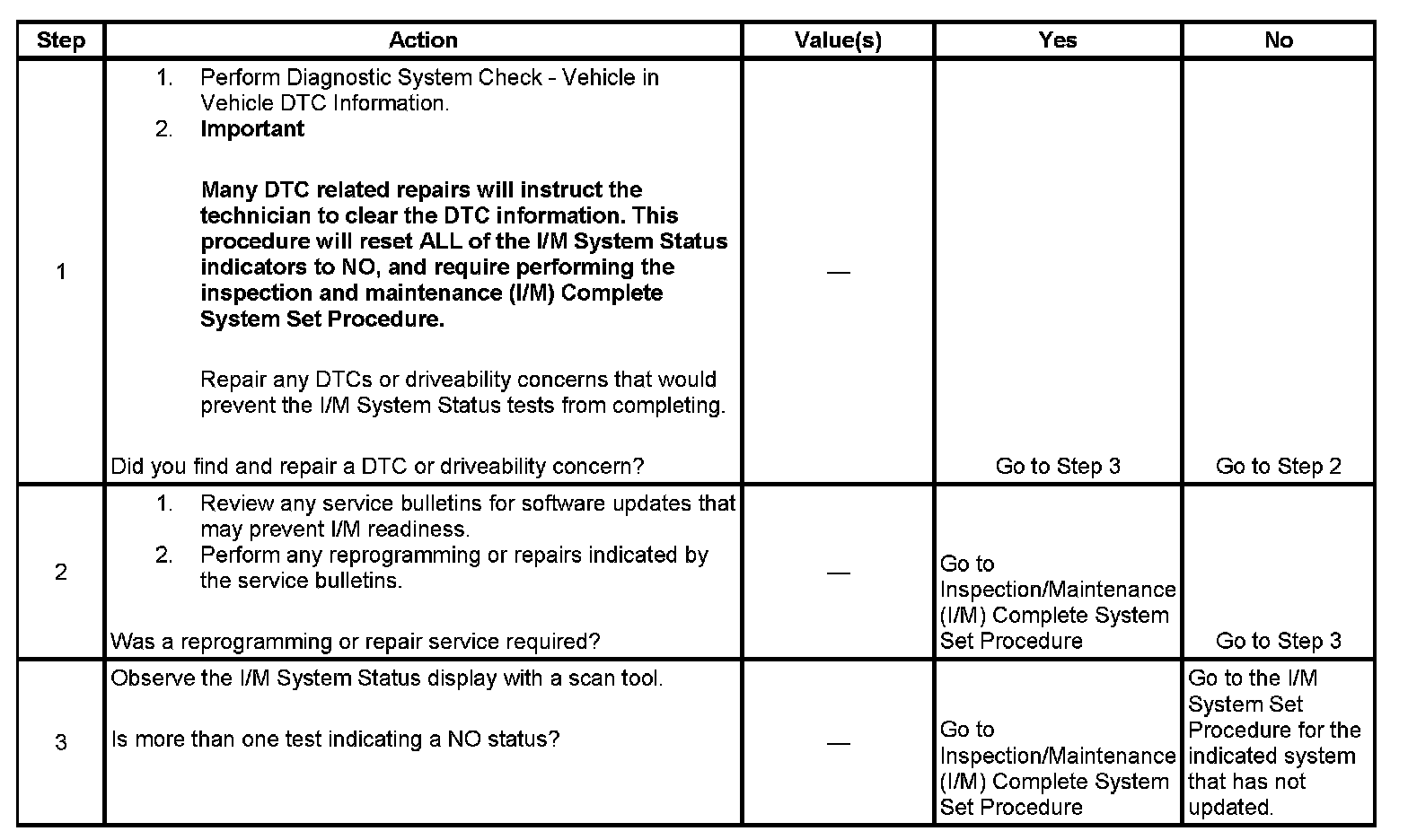 For the specific DTCs required for each system, refer to Inspection/Maintenance (I/M) System DTC Table. Systems such as fuel delivery, misfire, and comprehensive components may not be listed in a system status list. These tests run continuously and do not require an I/M System Status indicator. Inspection/Maitenance (I/M) System (DTC) Table
