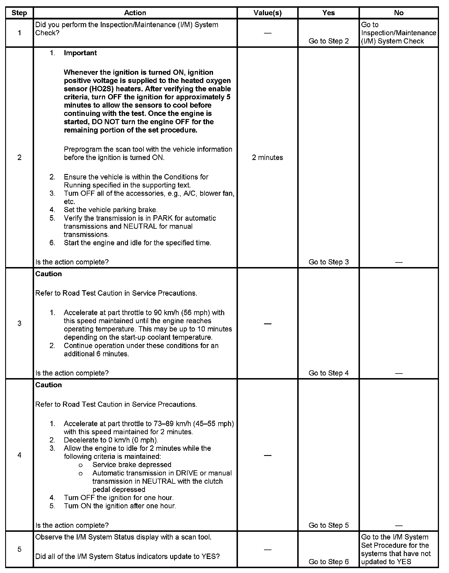 The purpose of the inspection and maintenance (I/M) Complete System Set Procedure is to satisfy the enable criteria necessary to execute all of the I/M readiness diagnostics, and complete the drive cycles for those particular diagnostics. When all diagnostic tests are completed, the I/M System Status indicators are set to YES. Perform this procedure when more than one of the I/M System Status indicators are set to NO.