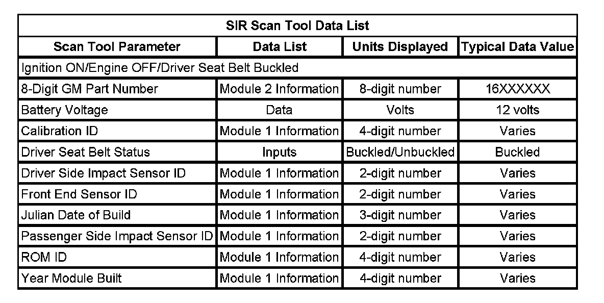 The SIR scan tool data list contains all the restraint system related parameters that are available on the scan tool. The parameters in the list are arranged in alphabetical order. The column, Data List, indicates the location of the parameter within the scan tool menu selections.