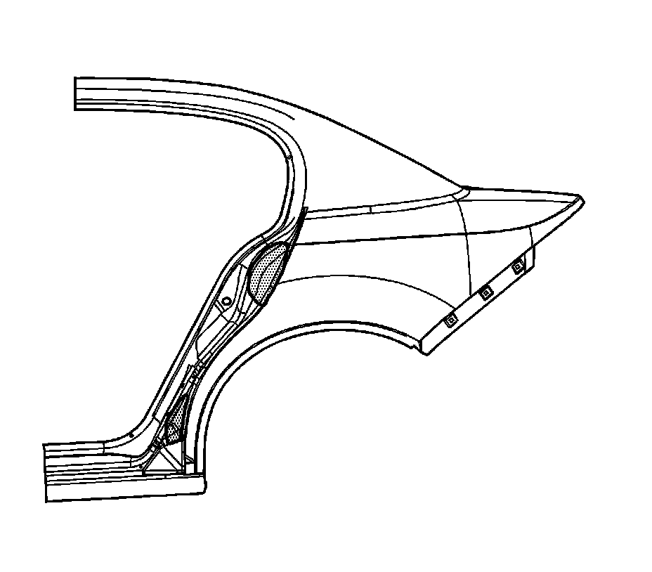 7. On the sedan, structural adhesive is present at the joint between the battery tray and the rear floor pan. Heat the quarter panel at the locations shown with a small flame from an oxy-acetylene torch to release the bond to the quarter panel.