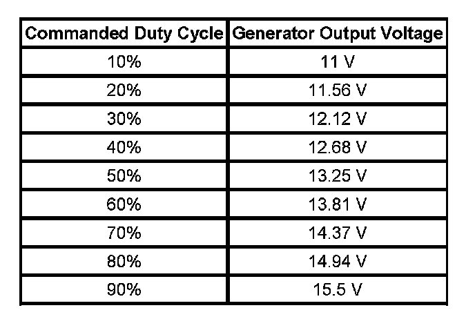 The engine control module (ECM) controls the generator through the generator L-terminal control circuit. The signal is a 5-volt pulse width modulation (PWM) signal of 128 Hz with a duty cycle of 0-100 percent. Normal duty cycle is between 5-95 percent. Between 0-5 percent and 95-100 percent are for diagnostic purposes. The following table shows the commanded duty cycle and output voltage of the generator.