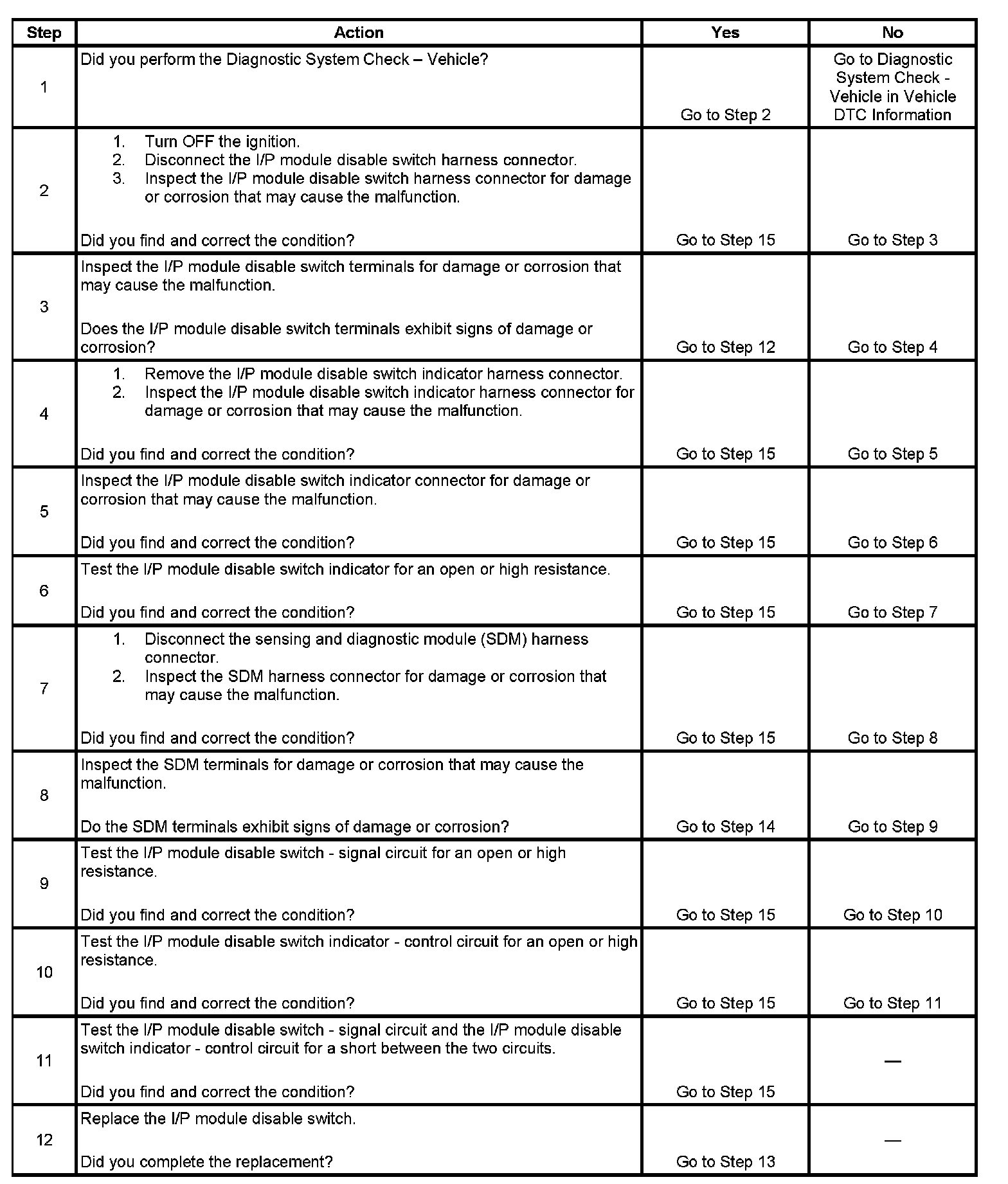 11. This step test to see if there is a short between the I/P module disable switch-signal and the I/P module disable switch indicator-control circuits.