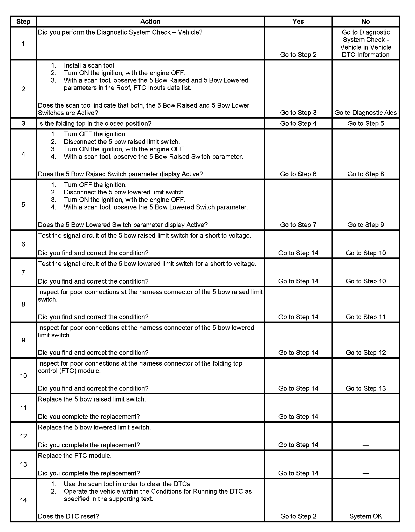 The folding top control (FTC) module supplies accessory voltage to the 5 bow raised and 5 bow lowered limit switches. It monitors the signal circuits of these switches to determine the 5 bow raised and 5 bow lowered position of the top. When the top is in the closed position the following definitions of the limit switches will be true: