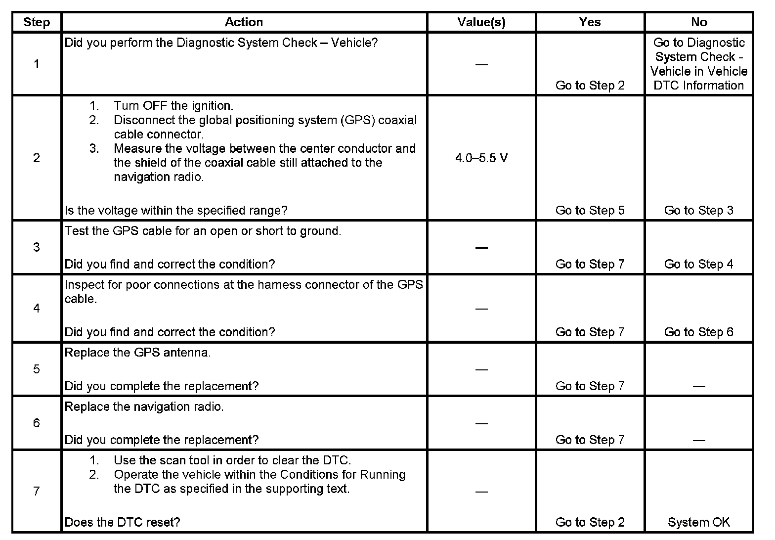 The numbers below refer to the step numbers on the diagnostic table.