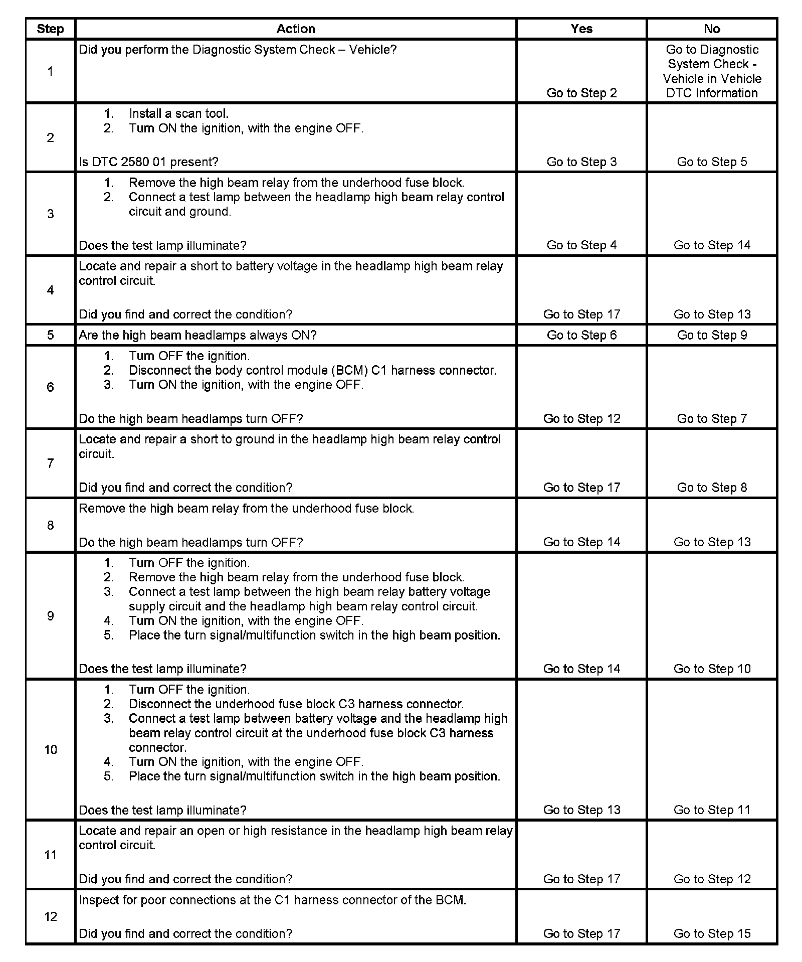 - DTC B2580 06 will set when the BCM detects an open or short to ground in the headlamp high beam relay control circuit.
