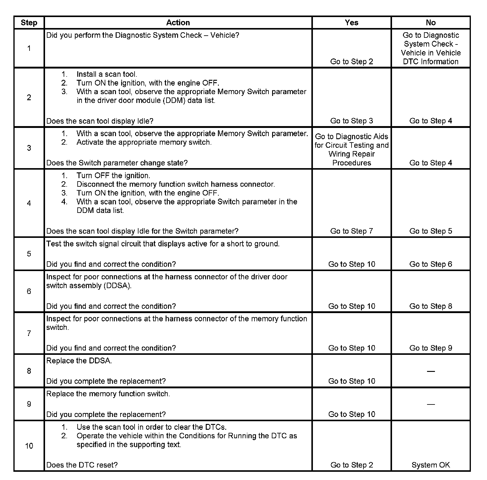 If a memory recall switch is active for 30 continuous seconds, the switch will be considered shorted, and the DDSA will set this DTC.