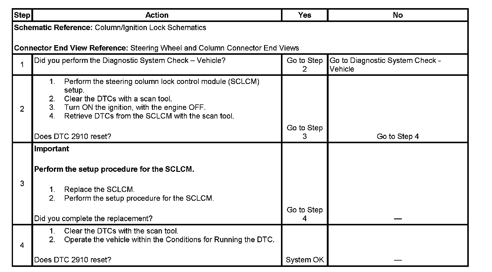 The steering column lock control module (SCLCM) will unlock the steering column if the power mode is on and the SCLCM and remote control door lock receiver (RCDLR) passwords match. If the SCLCM and RCDLR passwords do not match, the DTC B2910 will set.