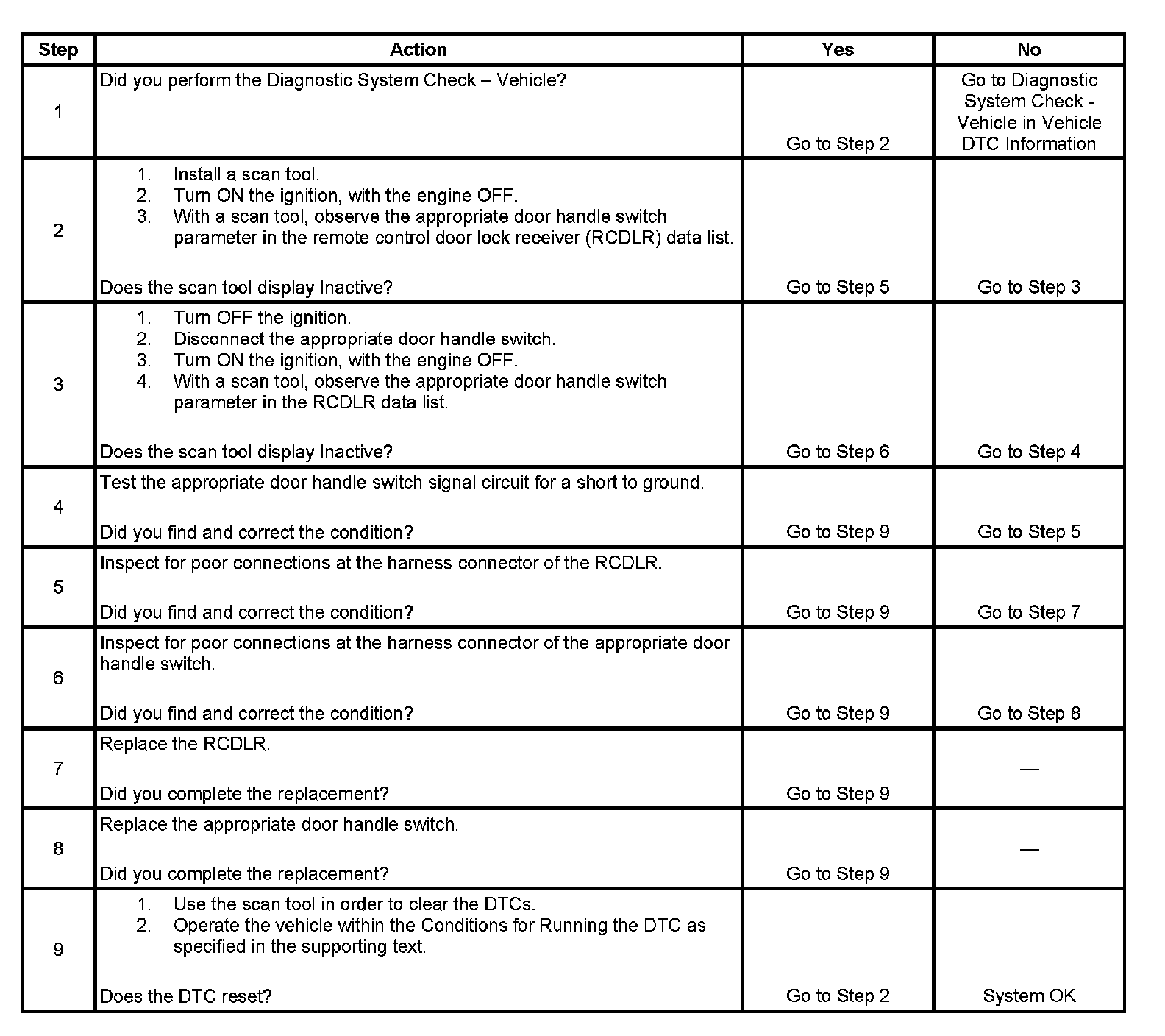 - The RCDLR detects a short to ground on an interior or exterior door handle switch signal circuit.