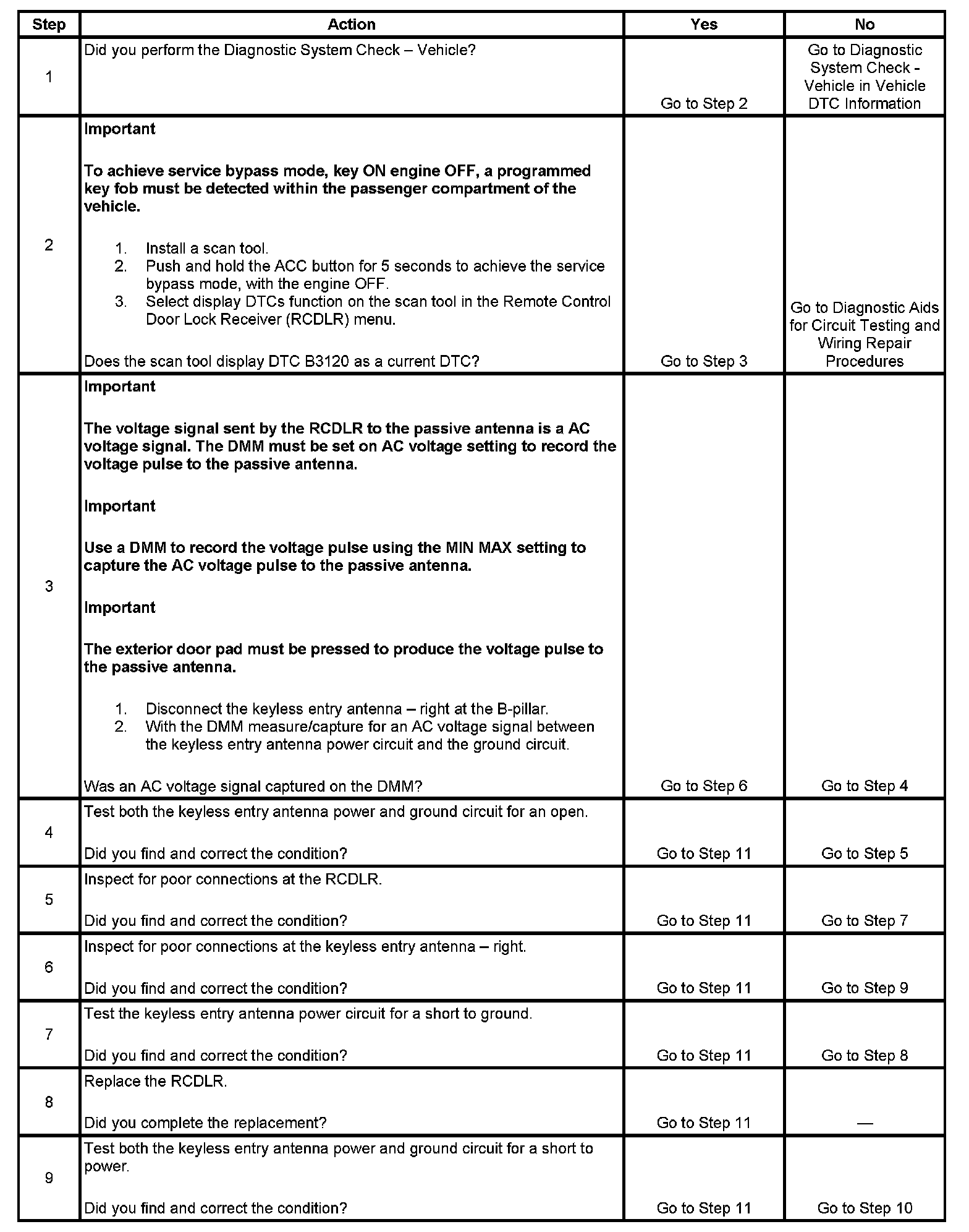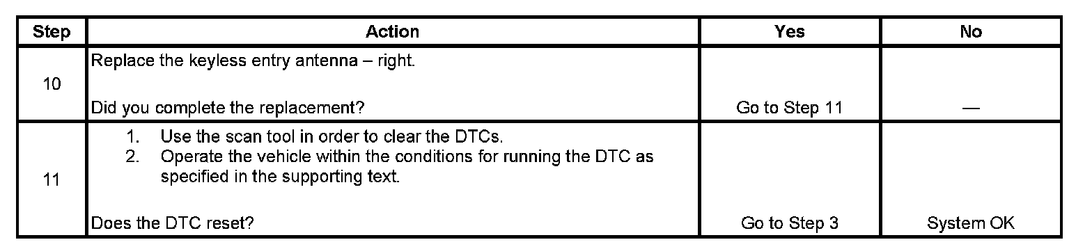 The remote control door lock receiver (RCDLR) will set this DTC during antenna activation if the keyless entry antenna - right is open, shorted to battery, or shorted to ground and an authentication occurs. The RCDLR can only set a DTC when the vehicle system voltage is between 9-16 volts.