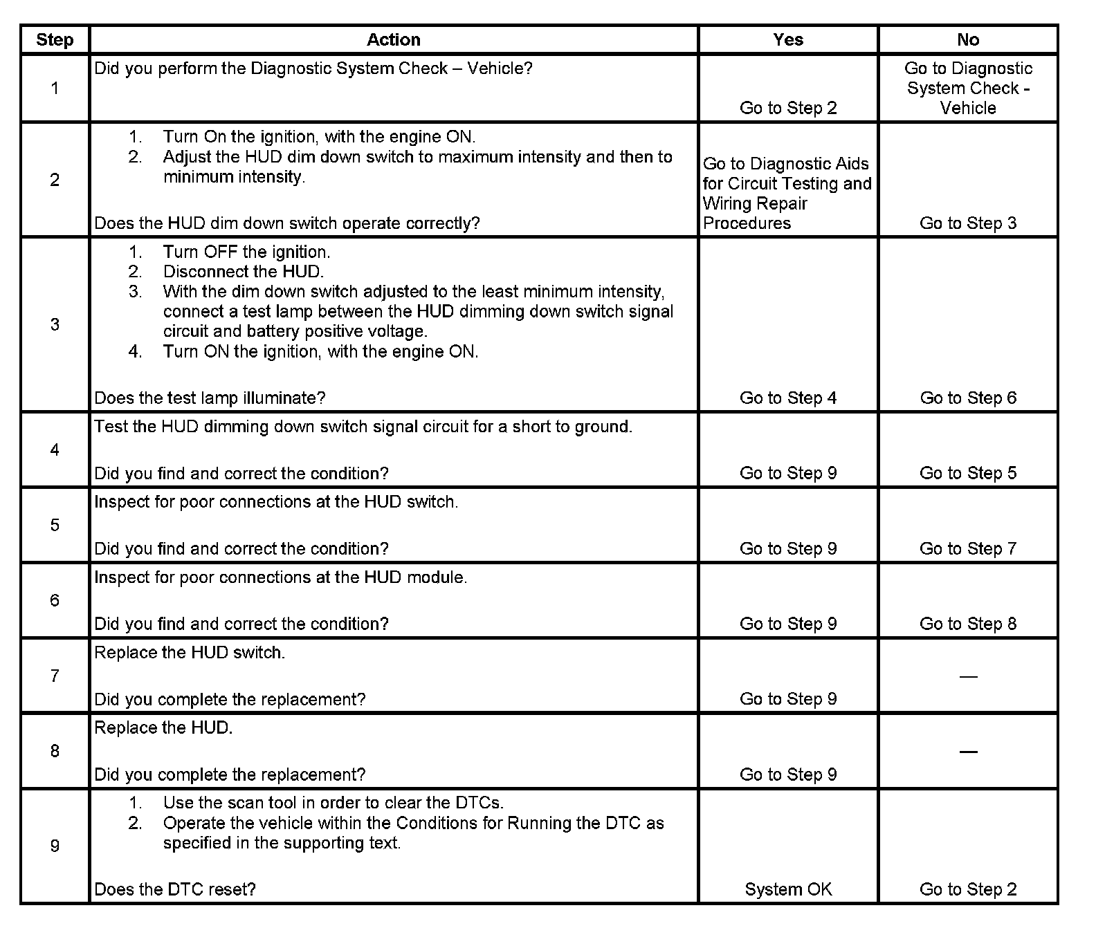 The head-up display (HUD) monitors the HUD dimming down switch signal circuit in order to perform the switch functions. When the HUD dimming down switch is depressed and the ignition is in the RUN position, the dimming down switch signal to the HUD is low. When the HUD detects that the HUD dimming down switch signal is low for greater than 60 seconds, DTC B3659 sets.