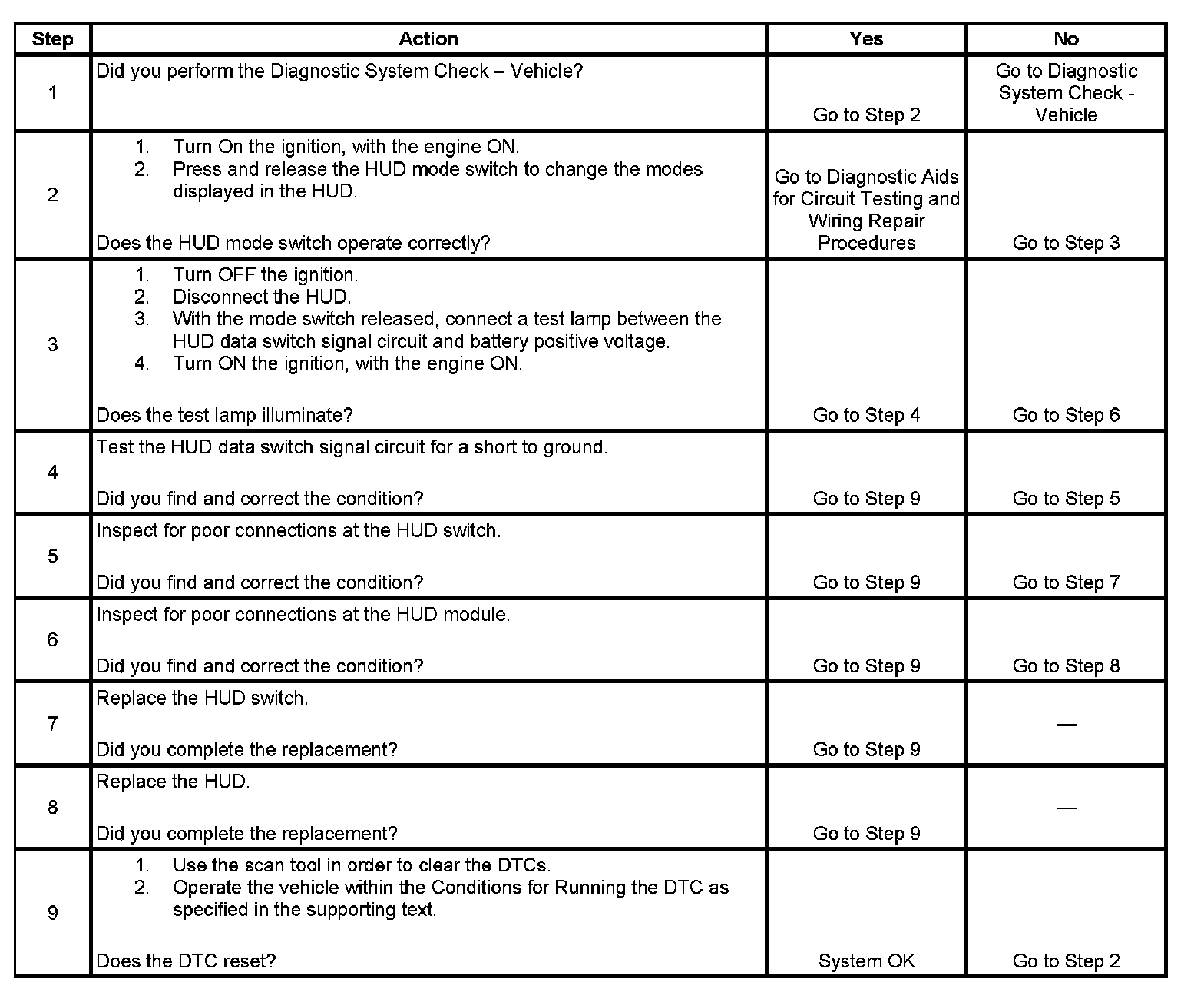 The head-up display (HUD) monitors the HUD mode switch signal circuit in order to perform the switch functions. When the HUD mode switch is depressed and the ignition is in the RUN position, the mode switch signal to the HUD is low. When the HUD detects that the HUD mode switch signal is low for greater than 60 seconds, DTC B3744 sets.