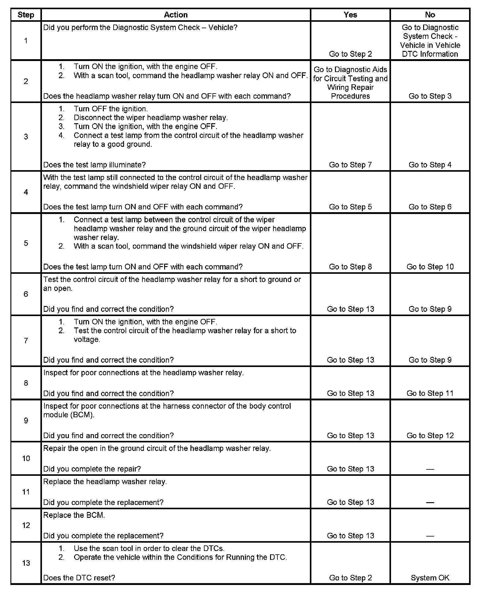 The BCM detects a short to ground in the headlamp washer relay control circuit when the output is active.