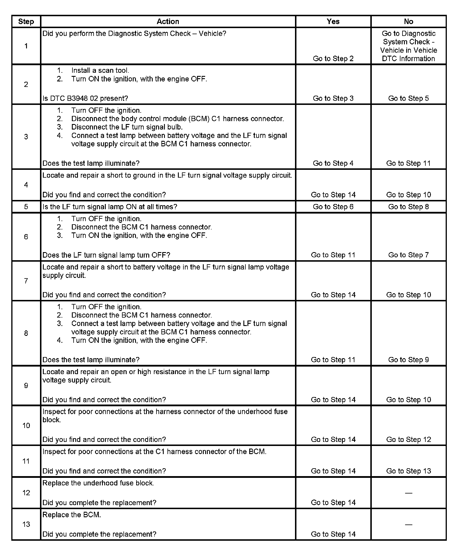 - DTC B3948 02 will set when the BCM detects a short to ground in the LF turn signal voltage supply circuit.