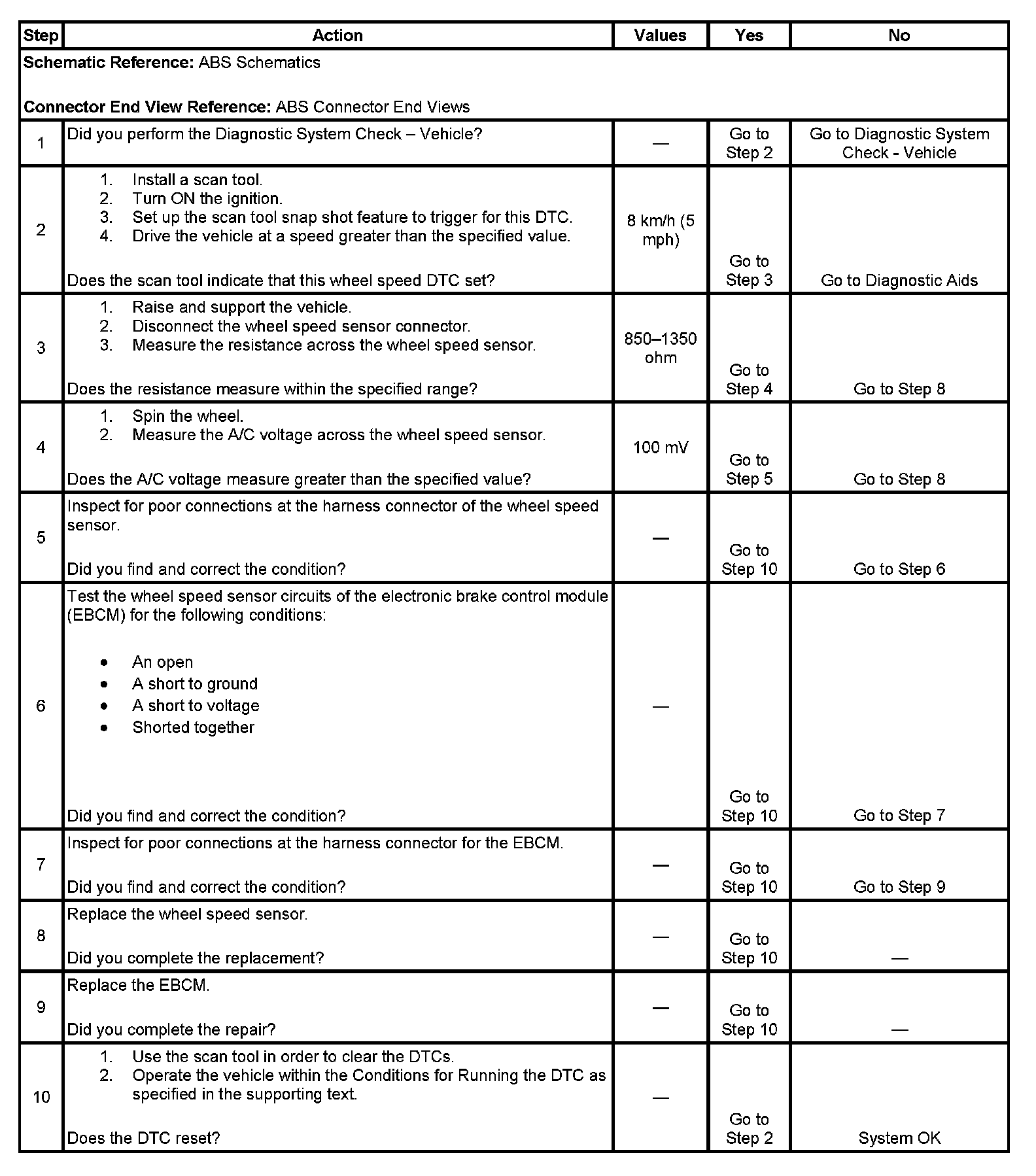 ^ An open - the wheel speed sensor signal circuit voltage is greater than 4.25 volts and wheel speed sensor return circuit voltage is less than 0.75 volts.