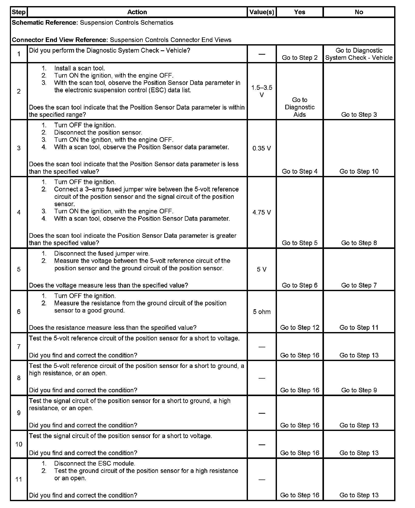 The electronic suspension control (ESC) module supplies 5 volts to the position sensors. The position sensors use the supplied 5 volts to produce an analog output range of 0-5 volts. The ESC module calculates vehicle suspension settings based upon the voltage levels received back from the position sensors. The ESC model monitors for an out of range condition.