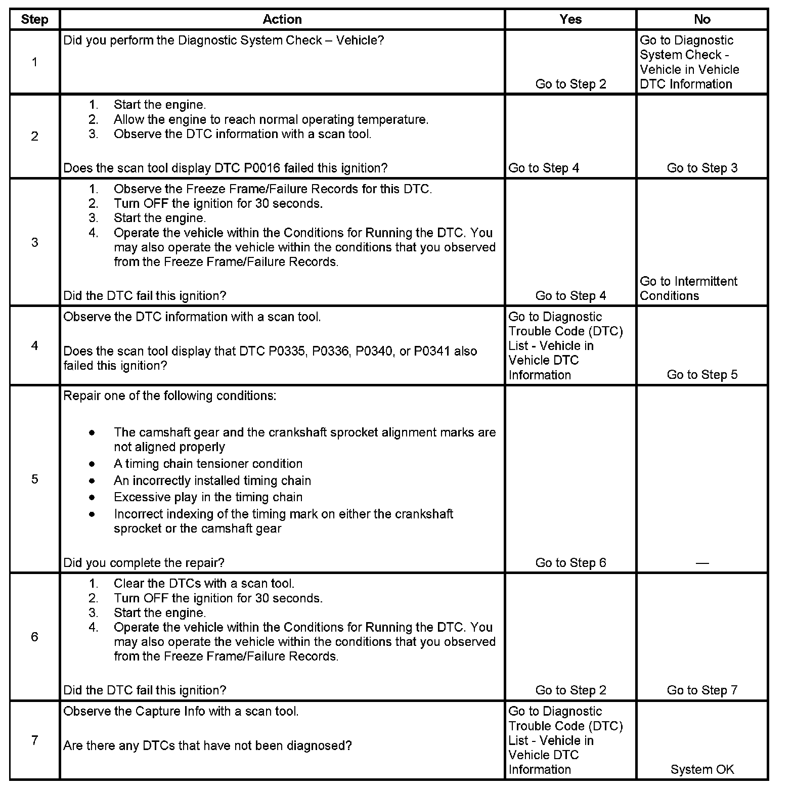 - DTCs P0335, P0336, P0340, P0341 are not set.