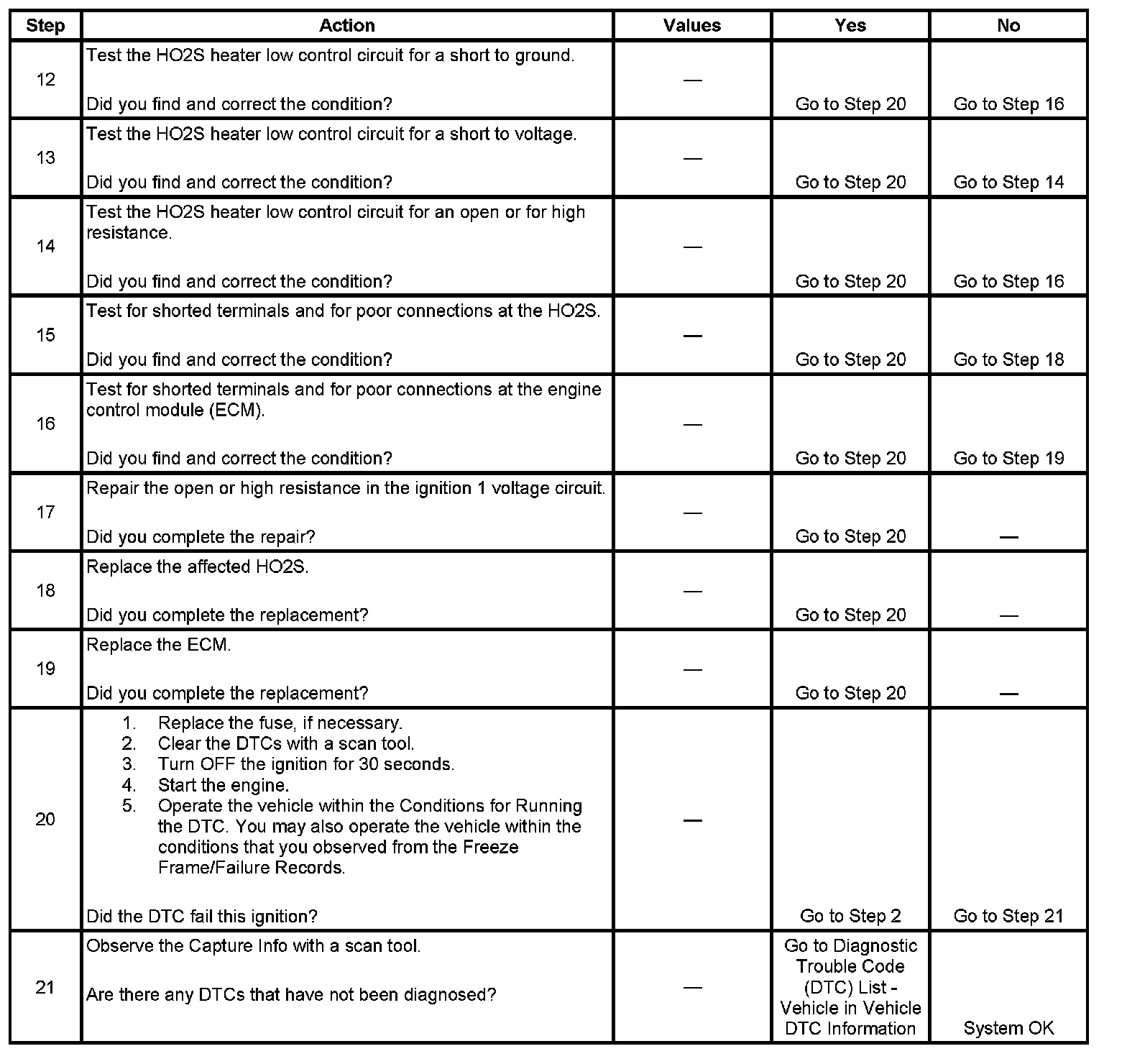 The ECM commands the heater ON or OFF to maintain a specific HO2S operating temperature range. The ECM monitors the voltage on the HO2S heater low control circuit for heater fault diagnosis. If the ECM detects that the HO2S heater low control circuit voltage is not within a specified range, DTC P0030 sets for HO2S bank 1 sensor 1, DTC P0036 sets for HO2S bank 1 sensor 2, DTC P0050 sets for HO2S bank 2 sensor 1, DTC P0056 sets for HO2S bank 2 sensor 2.